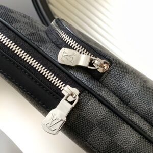 The Avenue Slingbag is made from Damier Graphite canvas with a Louis Vuitton Paris leather patch on the front outside pocket, bringing a contemporary twist. The adjustable nylon strap can be attached to the D-ring on right or left side of the bag. It’s more sustainable than earlier models, thanks to its canvas strap and lining.