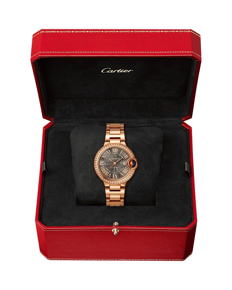 Ballon Bleu de Cartier watch, 33 mm, mechanical movement with automatic winding. 18K rose gold case set with 47 brilliant-cut diamonds totaling 0.68 carats. Fluted crown decorated with a cabochon sapphire. Gray guilloché dial. Blued-steel sword-shaped hands. Sapphire crystal. 18K rose gold bracelet. Case thickness: 10 mm. Water-resistant to 3 bar (approx. 30 meters).