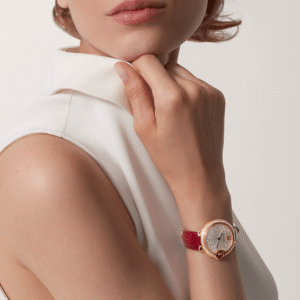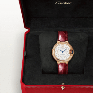 Ballon Bleu de Cartier watch, 33 mm. Self-winding mechanical movement. Rose gold 750/1000 case set with 47 brilliant-cut diamonds totaling 0.68 carats. Fluted crown decorated with a cabochon sapphire. Matt silvered stamped sunray dial set with 21 brilliant-cut diamonds totaling 0.10 carats. Blued-steel sword-shaped hands. Sapphire crystal. Burgundy alligator leather strap, rose gold 750/1000 ardillon buckle. Thickness: 0.4”. Water-resistant up to 3 bar (approx. 30 meters/100 feet).