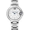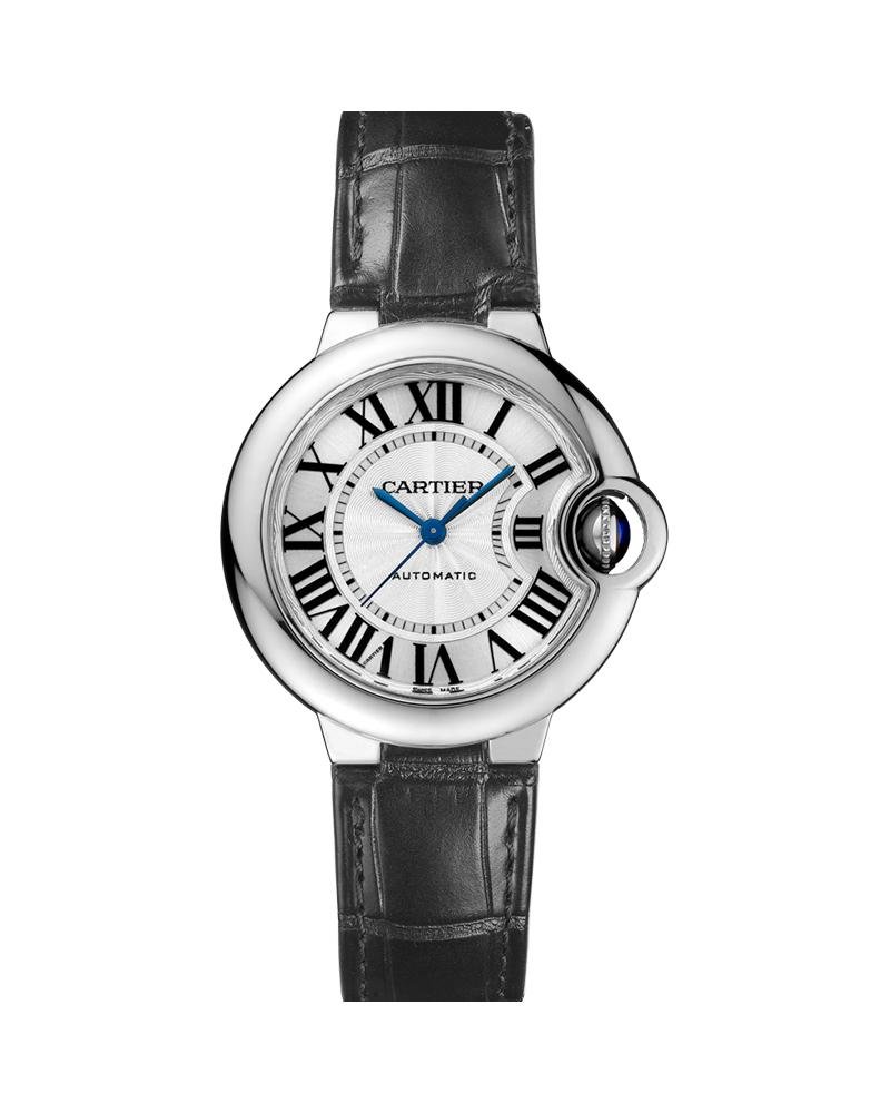 Ballon Bleu de Cartier watch, 33 mm, mechanical movement with automatic winding. Steel case, fluted crown decorated with a synthetic spinel cabochon, silvered guilloche opaline dial, Roman numerals, blued-steel sword-shaped hands, sapphire crystal, black leather strap, double adjustable folding steel buckle