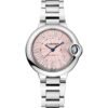 Ballon Bleu de Cartier watch, 33mm, mechanical movement with automatic winding, steel case, steel fluted crown set with a synthetic cabochin-shaped spinel. Roman numerals with Sword-shaped hands, Sapphire glass, steel bracelet,