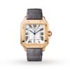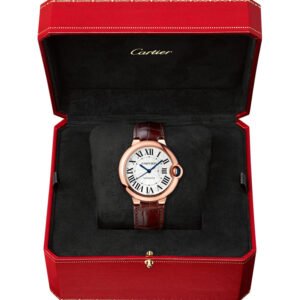 Ballon Bleu de Cartier watch, 36 mm, self-winding mechanical movement. 18K pink gold case, fluted crown set with a blue cabochon-shaped sapphire, silvered guilloche lacquered opaline dial, Roman numerals, blued-steel sword-shaped hands, sapphire crystal, dark brown leather strap, 18K pink gold ardillon buckle.