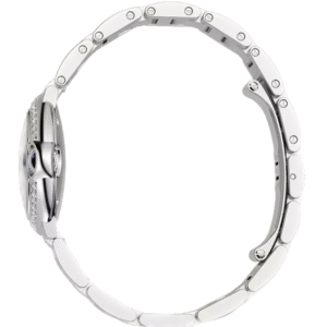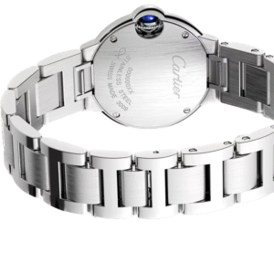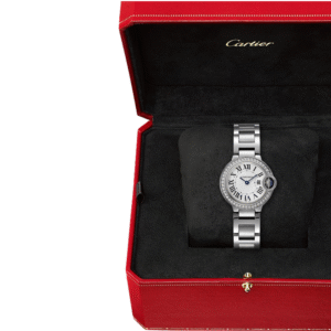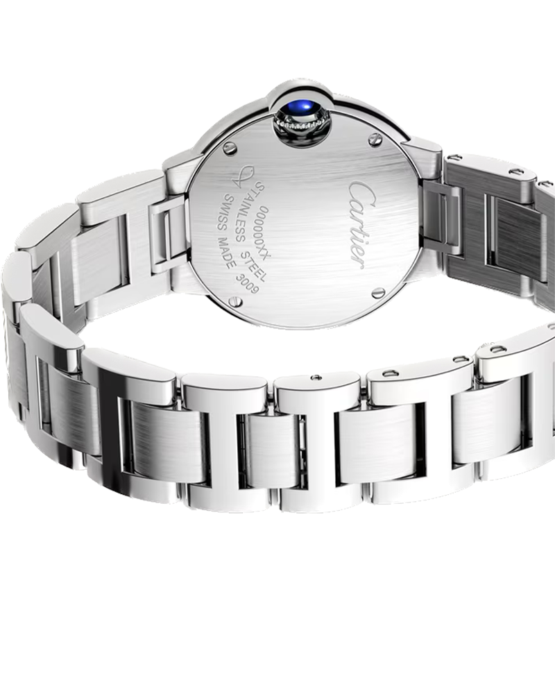 Ballon Bleu de Cartier watch, 28 mm, quartz movement. Steel case, fluted steel crown set with a synthetic cabochon-shaped spinel. Steel bezel set with 42 diamonds totaling 0.48 carats. Opaline dial. Blued-steel sword-shaped hands. Sapphire crystal. Interchangeable steel bracelet, wrist size 6.5”. Thickness: 0.35”. Water-resistant to 3 bar (approx. 30 meters/100 feet).