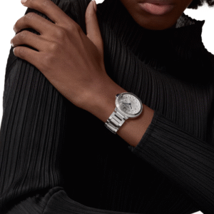 Steel bezel set with 54 diamonds totaling 0.78 carats. Matte silvered sunray-brushed dial set with 21 brilliant-cut diamonds totaling 0.19 carats. Blued-steel sword-shaped hands. Sapphire crystal. Interchangeable steel bracelet. Case diameter: 36 mm, thickness: 12.06 mm. Water-resistant up to 3 bar (approx. 30 meters/100 feet).