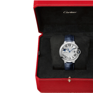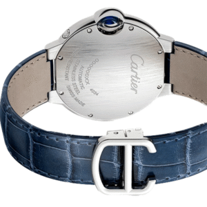 Ballon Bleu de Cartier watch, 37 mm. Mechanical movement with automatic winding, moon phases. Case in steel, fluted crown set with a synthetic cabochon-shaped spinel. Silvered guilloché dial. Moon phases at 9 o’clock. Blued-steel sword-shaped hands. Sapphire crystal. Blue alligator-skin strap, interchangeable steel folding buckle. Case thickness: 13 mm. Water-resistant to 3 bar (approx. 30 metres).