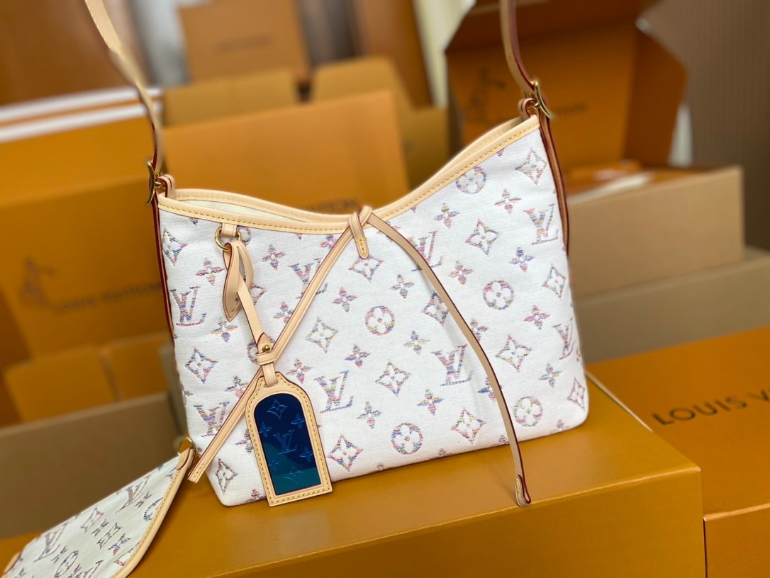 Part of the Nautical capsule, this CarryAll PM is made from Monogram jacquard with natural cowhide-leather trim. The motif was created by weaving together 66 multicolored threads to create a Monogram with a subtle gradient of colors. Adding a luminous accent, this versatile city bag comes with a laser-engraved mirror charm – ideal for beauty touch-ups.