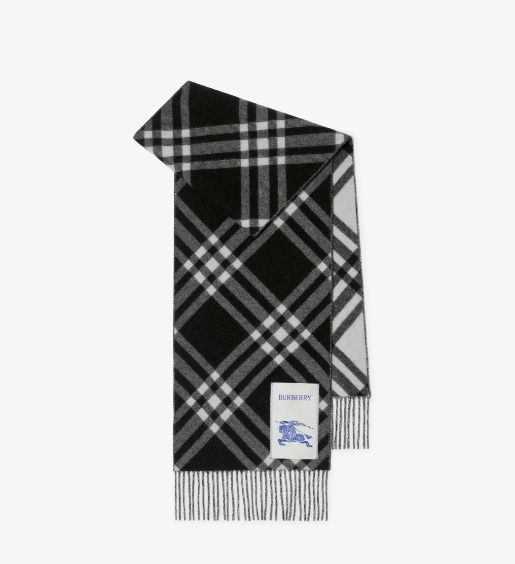 - A scarf in double-faced cashmere, jacquard-woven with a seasonal check at a Scottish mill founded in 1797. The fabric is washed in local spring water and receives an additional wash for an ultra-soft finish and raised nap.