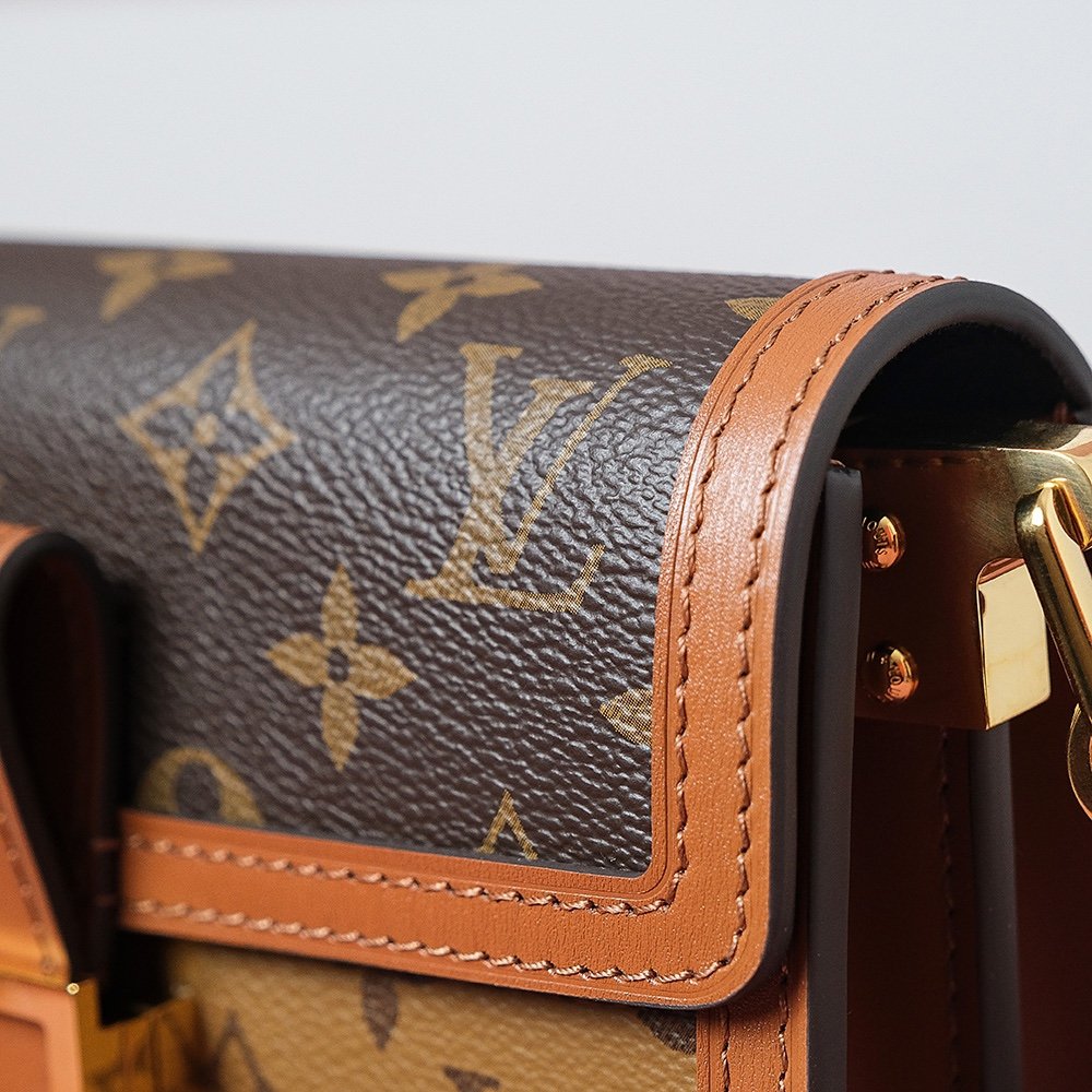 The Dauphine East-West Monogram handbag canvas sports a fashionably elongated silhouette, echoed in the Dauphine iconic rectangular LV closure. The interplay of two complementary Monogram canvases – classic and Reverse – lends this piece a signature appeal. The leather shoulder strap and the golden chain are both removable, offering a variety of styling options.