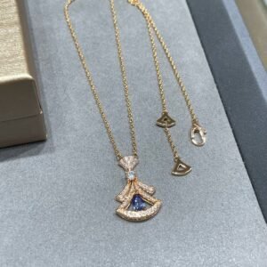 A refined expression of joyful femininity, the Divas’ Dream 18 kt rose gold necklace offers an elegant and colorful interpretation of the iconic fan-shaped motif. Deeply rooted in Bvlgari’s Roman heritage, the aesthetic signature of the collection is rendered through a delicate openwork frame with pavé diamonds embracing a pear-shaped tanzanite. Evoking the enchanting nuances of a Roman night sky, the creation is an ode to timeless beauty.