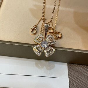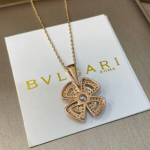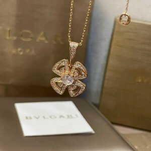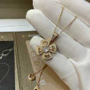 Blooming amongst the marvels of the Eternal City, Fiorever draws inspiration from the alluring four-petal flower cherished by the Romans as a symbol of happiness and joy. The blend of two meaningful words, Fiore, Italian for flower, and forever, Fiorever celebrates the Roman love for life with a striking, passionate design. Meant to sparkle with an eternal glow, Bvlgari’s precious floral icon is crafted with a central diamond embraced by four rose gold open-worked petals shimmering with pavé diamonds. Fiorever necklace in 18 kt rose gold with a diamond and pavé diamonds.