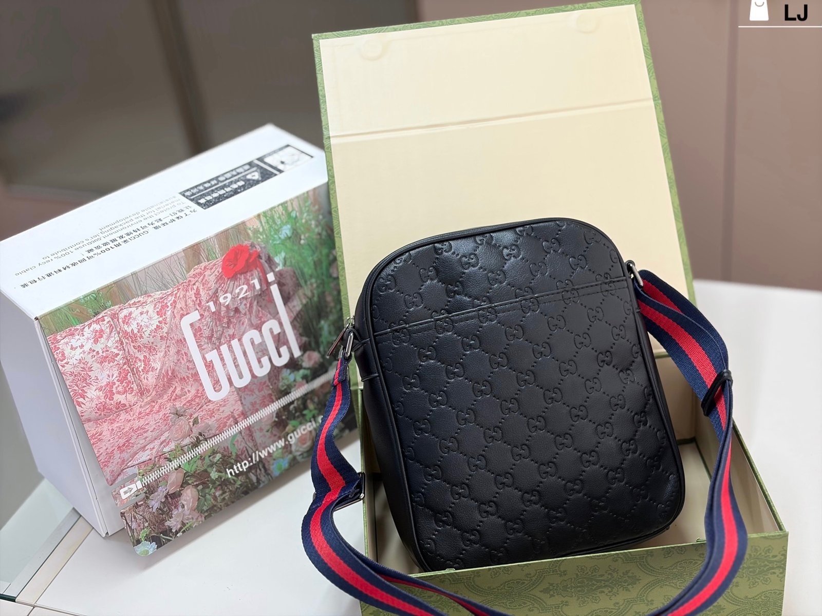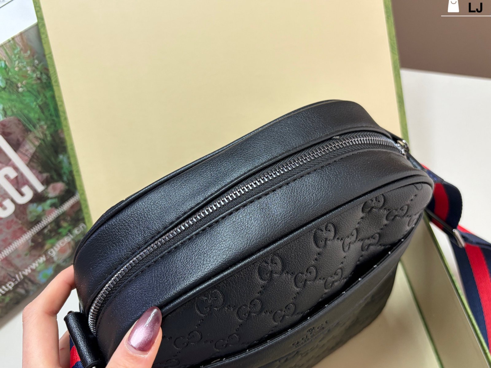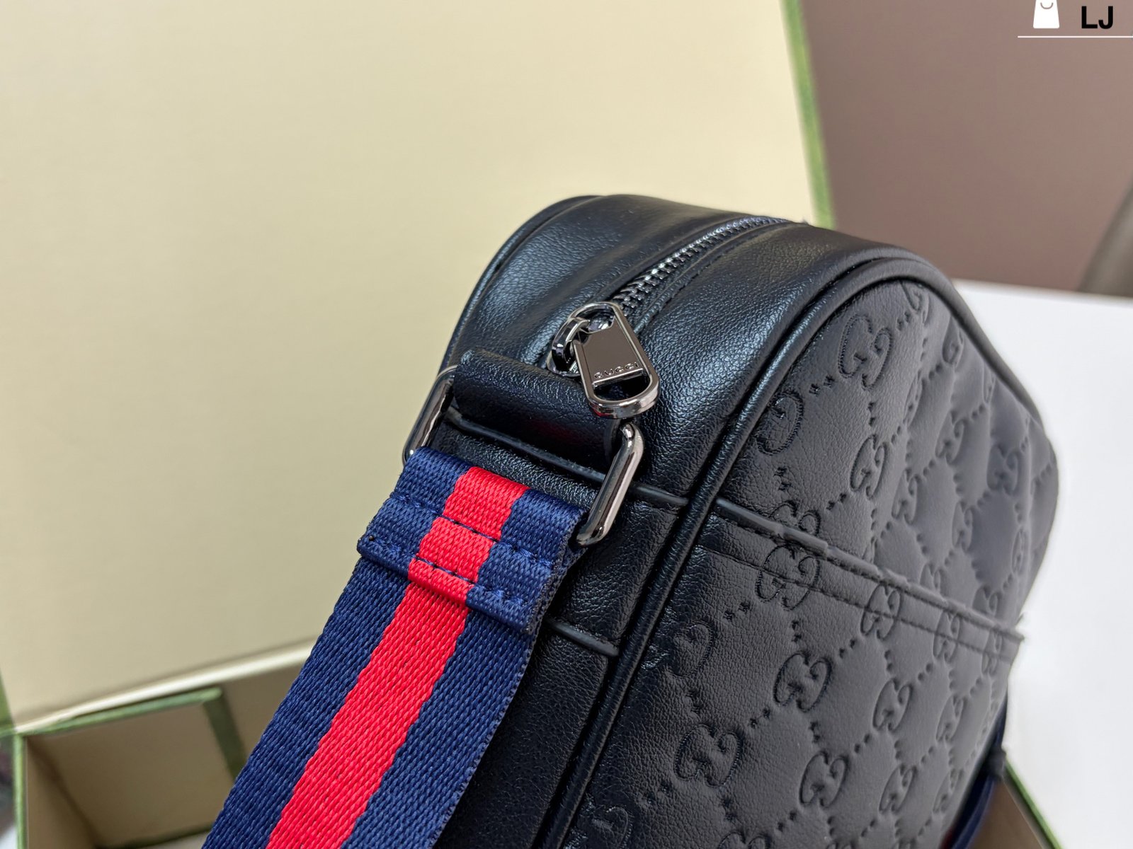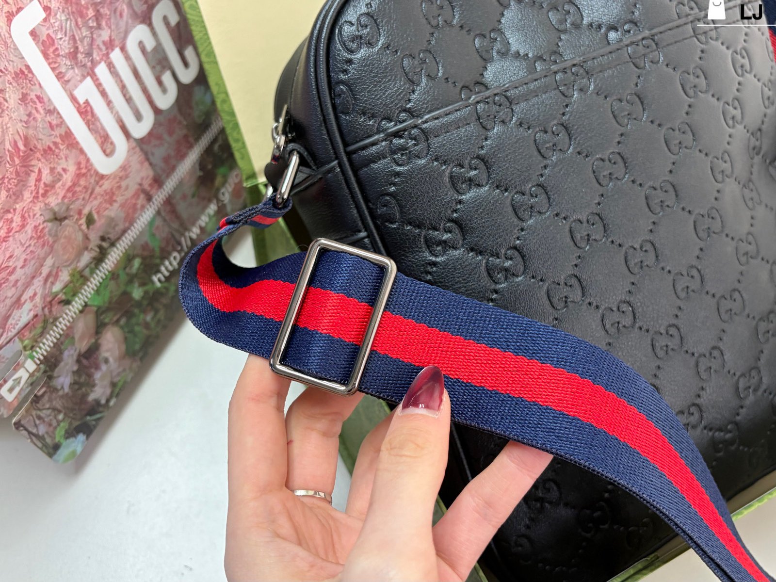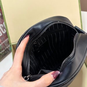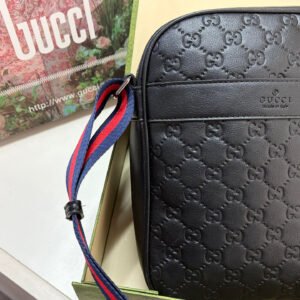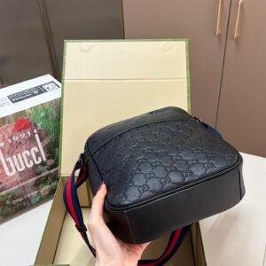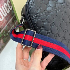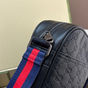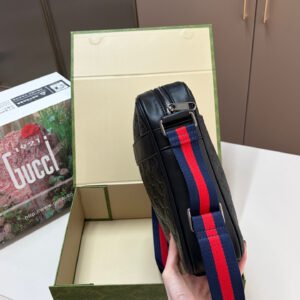 Gucci GG Supreme Black Crossbody Bag, made of classic double-G embossed leather, with a delicate texture and durability. The red and blue webbing shoulder strap is highly recognizable and exudes a stylish vibe. ✨
