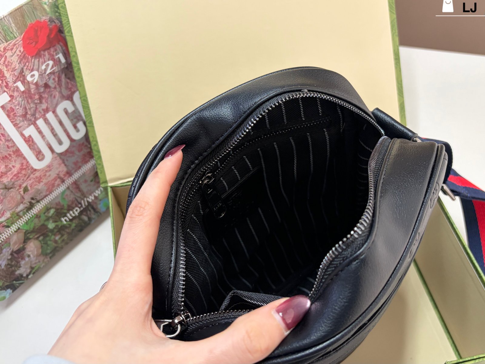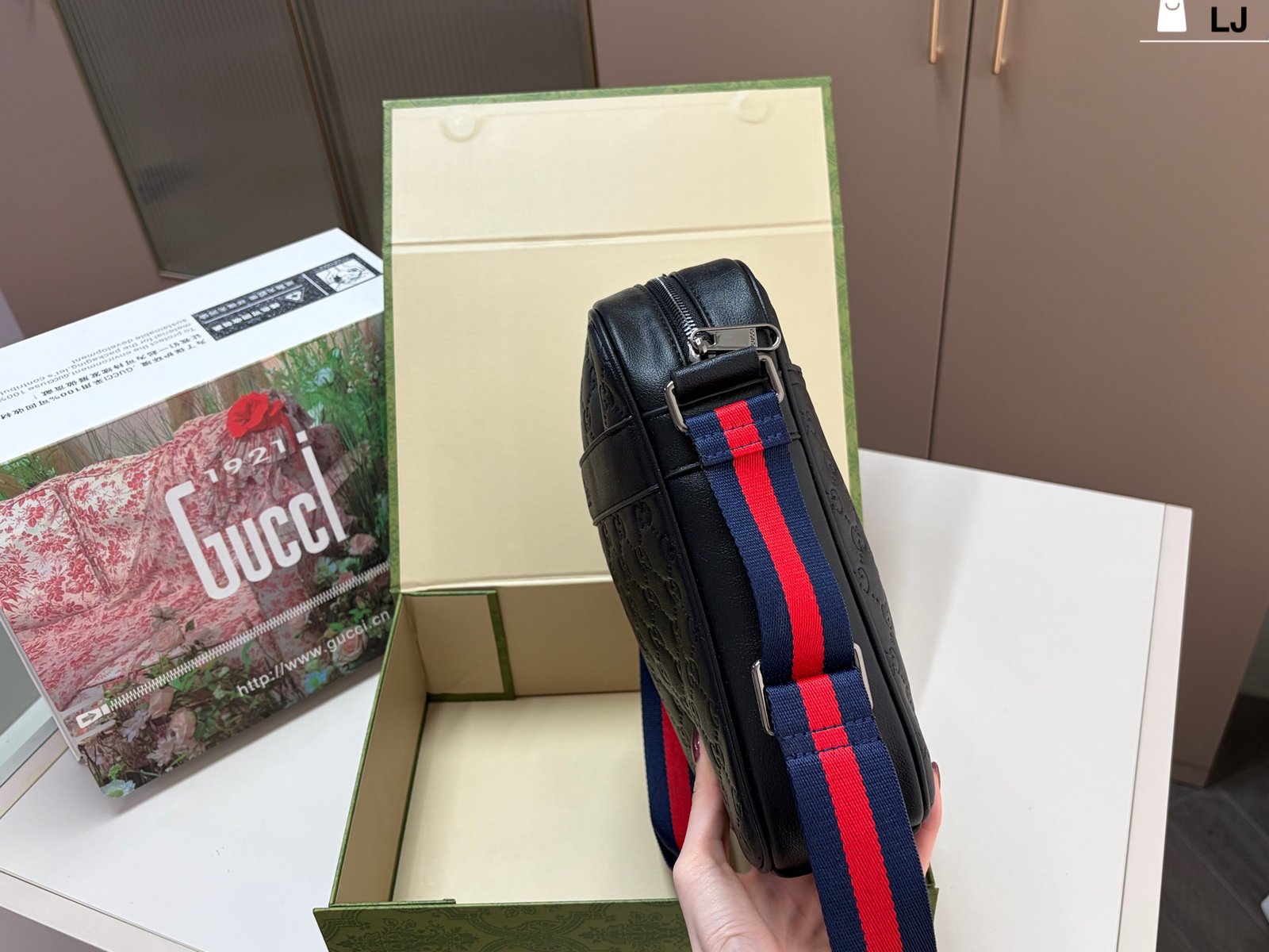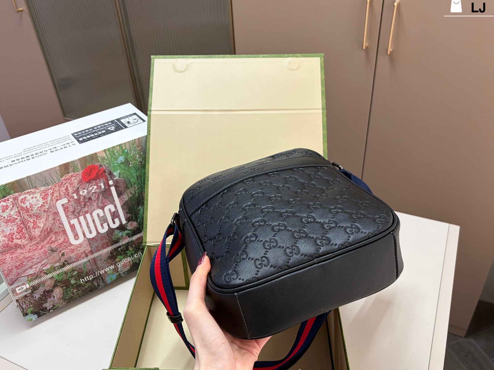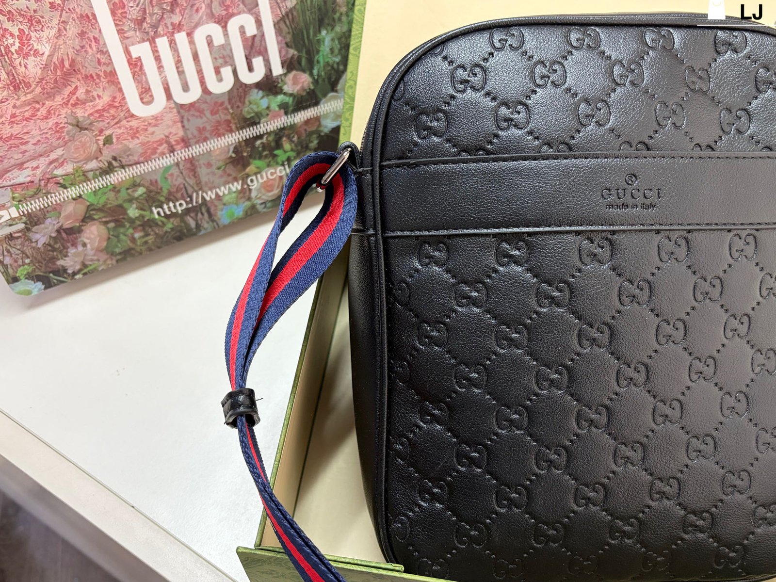 Gucci GG Supreme Black Crossbody Bag, made of classic double-G embossed leather, with a delicate texture and durability. The red and blue webbing shoulder strap is highly recognizable and exudes a stylish vibe. ✨