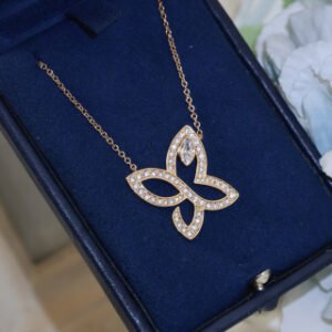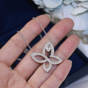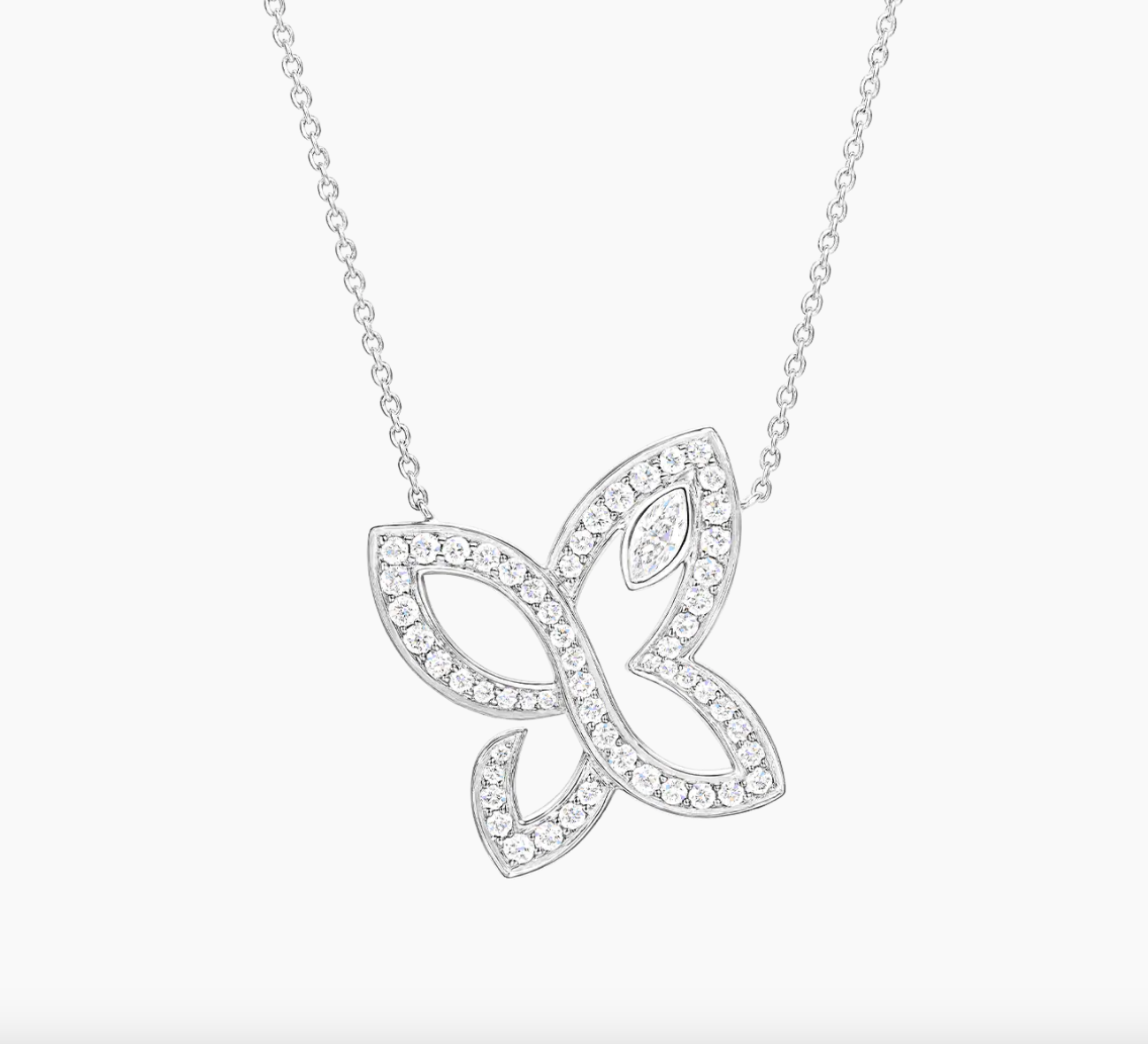 Capturing the enchanting majesty of a beautiful butterfly mid-flight, this Infinite Lily Cluster pendant sparkles with 56 round brilliant diamonds and 1 marquise-shaped diamond, weighing approximately 0.56 carats. This elegant and feminine piece celebrates the endless possibilities of love, with a graceful design that seemingly has no beginning or end.