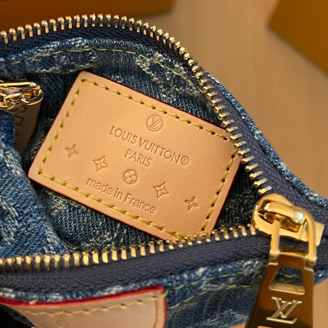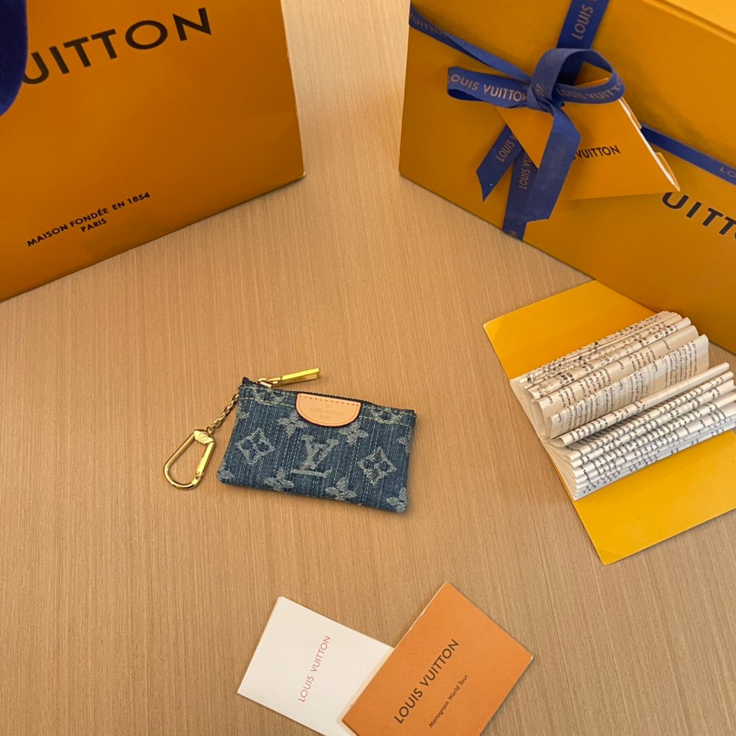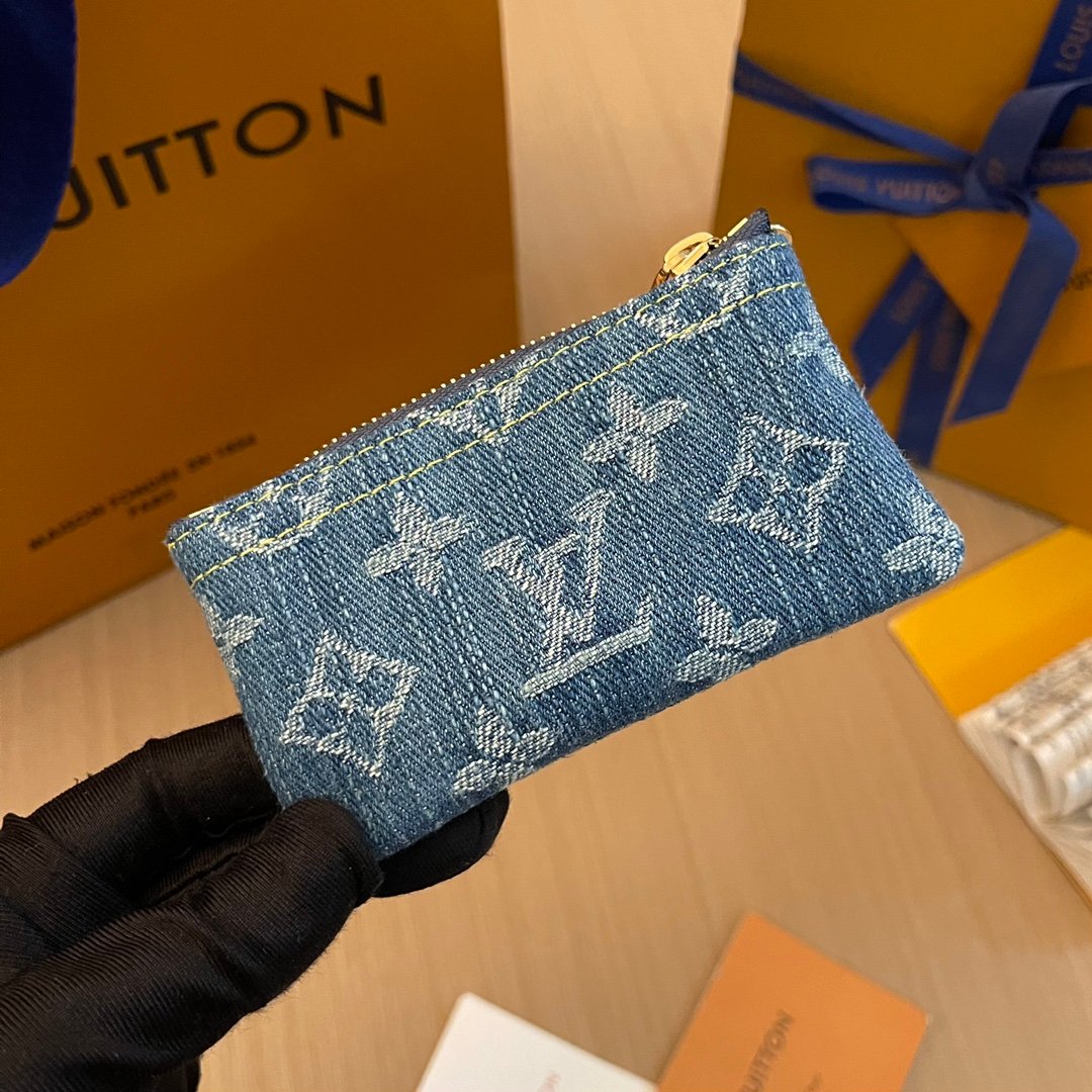 The Key Pouch is made from stone-washed Monogram Denim, with natural cowhide-leather trim and gold-color hardware. In addition to holding keys, it can also be used to securely carry cash and cards thanks to its zip closure. A small hook-and-chain allows it to be attached to a bag or belt.