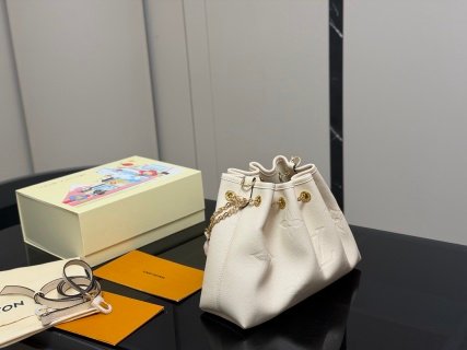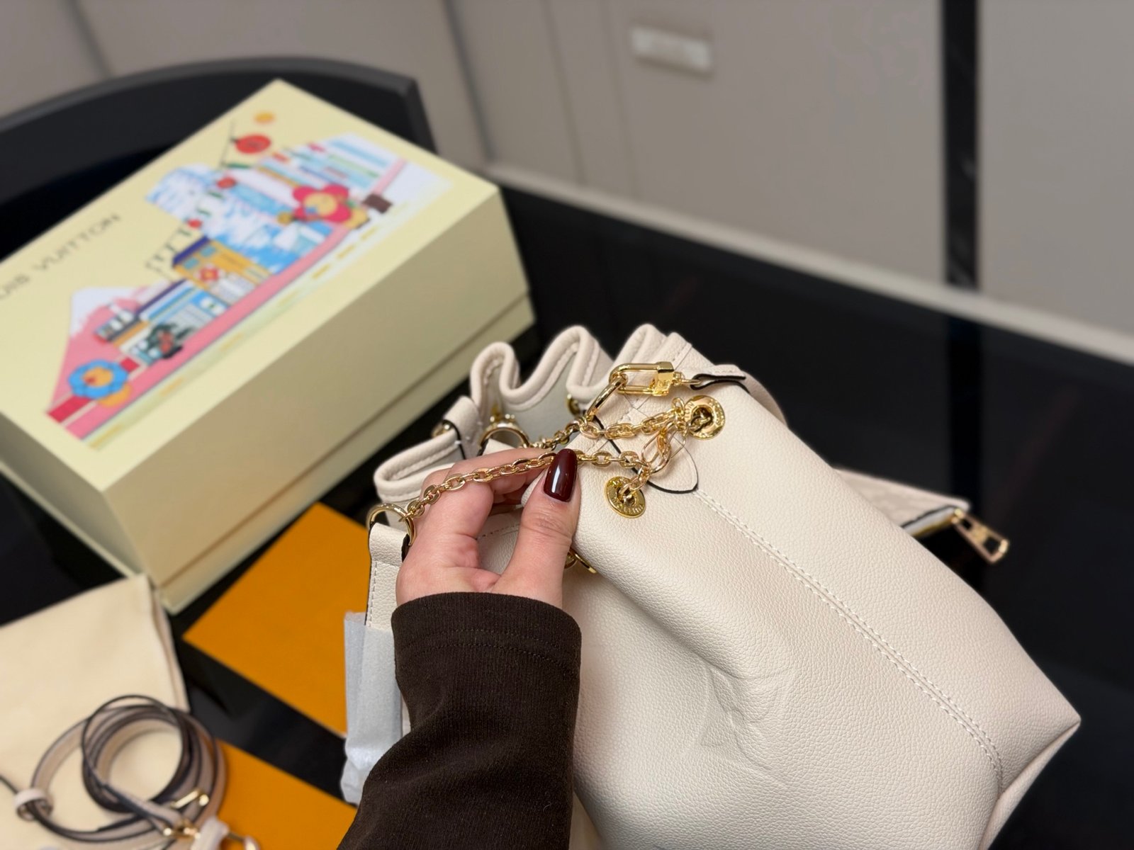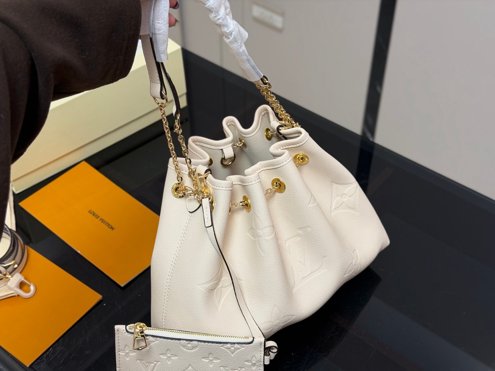 The LV Bundle bag is made from Monogram Empreinte leather with gold-color hardware, including on the chain drawstring. This “day to evening” bag’s sleek lines will match almost any summer outfit. It has two handles for fashionable hand carry as well as an adjustable and removable strap for comfortable cross-body and shoulder wear.