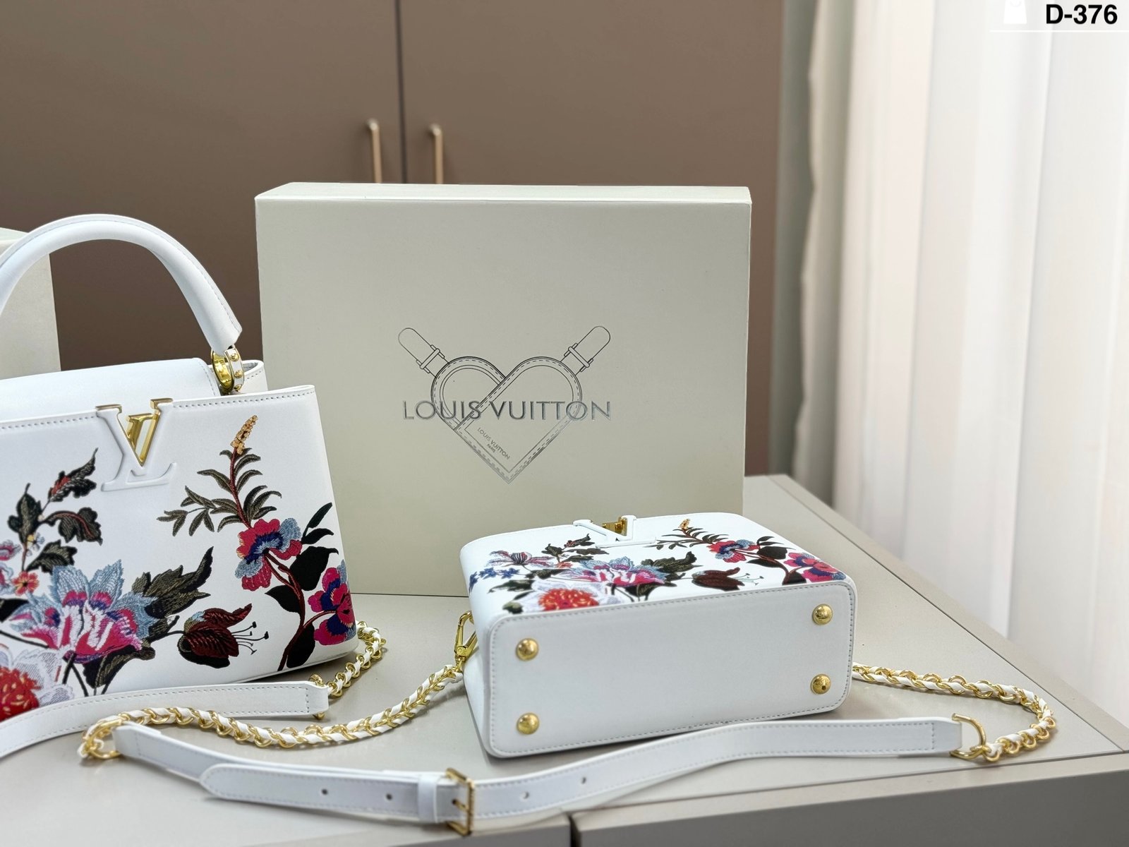 LV Capucines handbag with floral pattern, made of cowhide leather, full of artistic flair 🎨. Metal LV logo + chain shoulder strap, can be carried by hand or crossbody, versatile and easy to match!