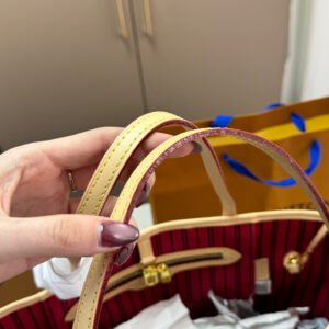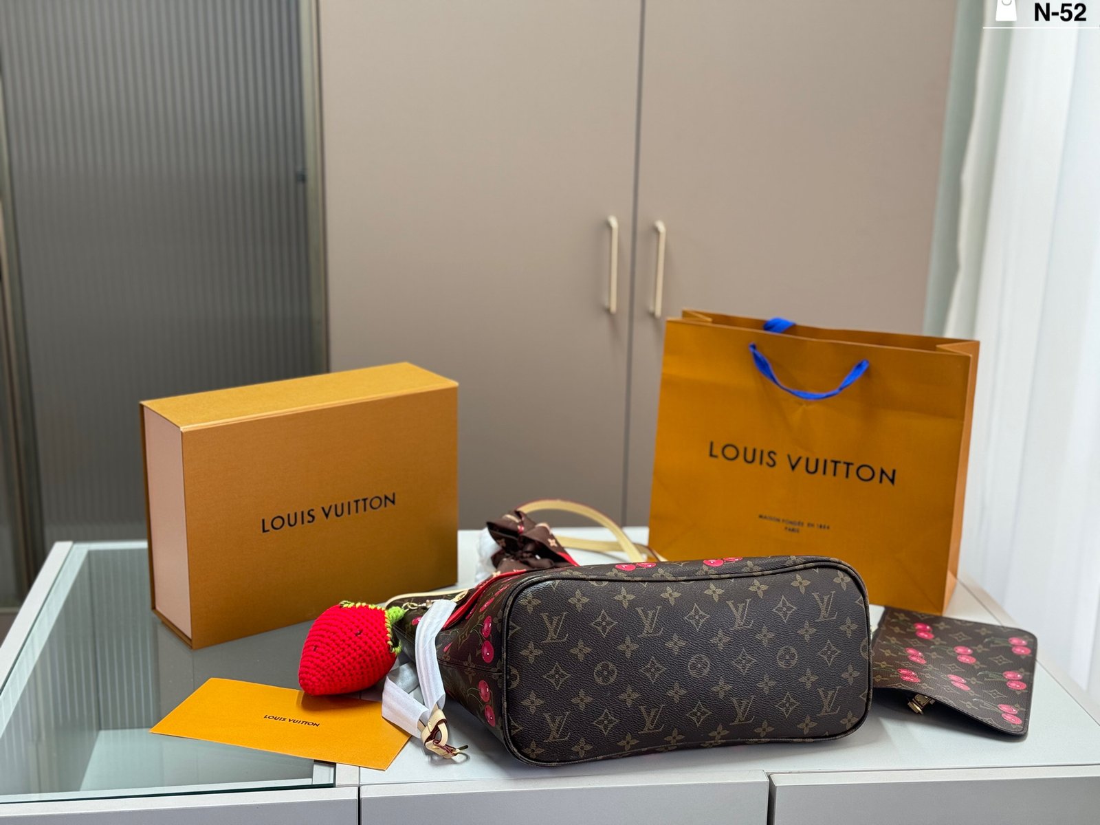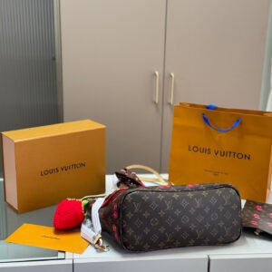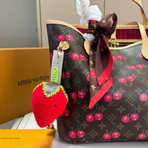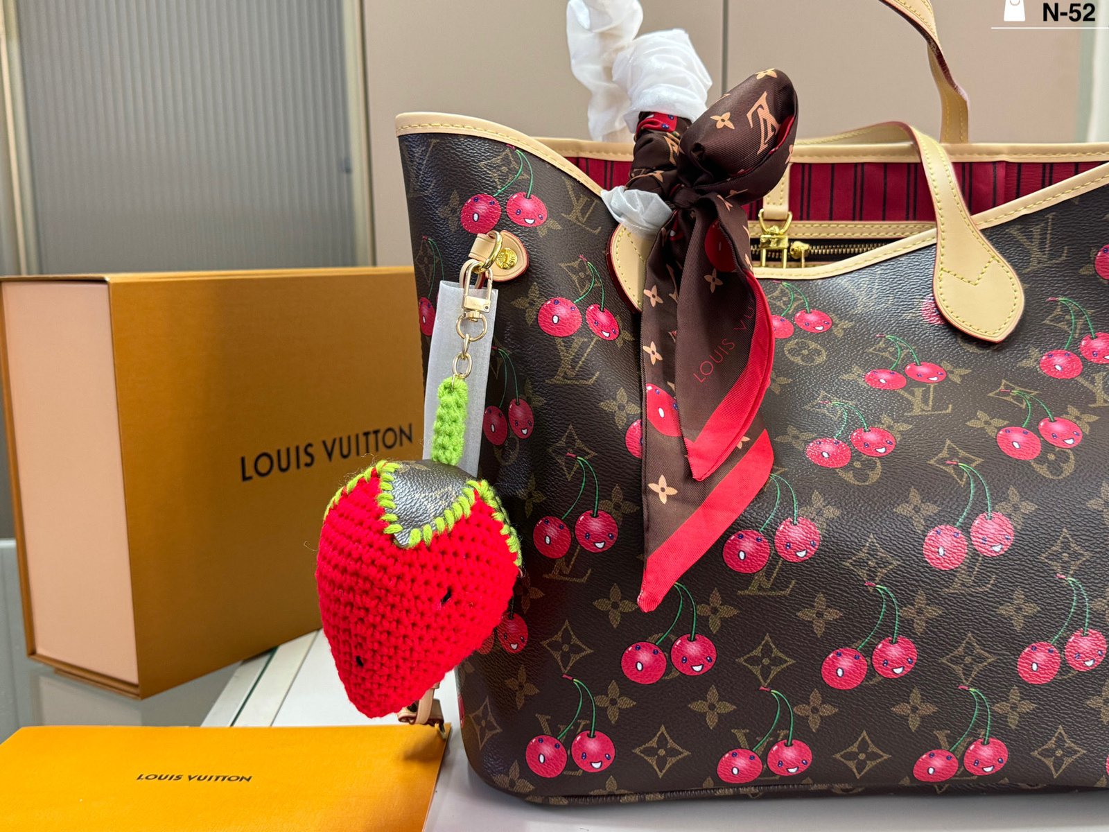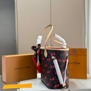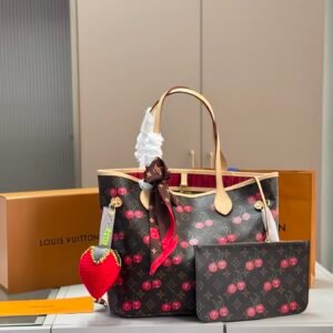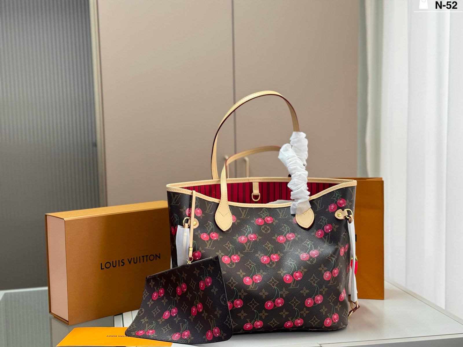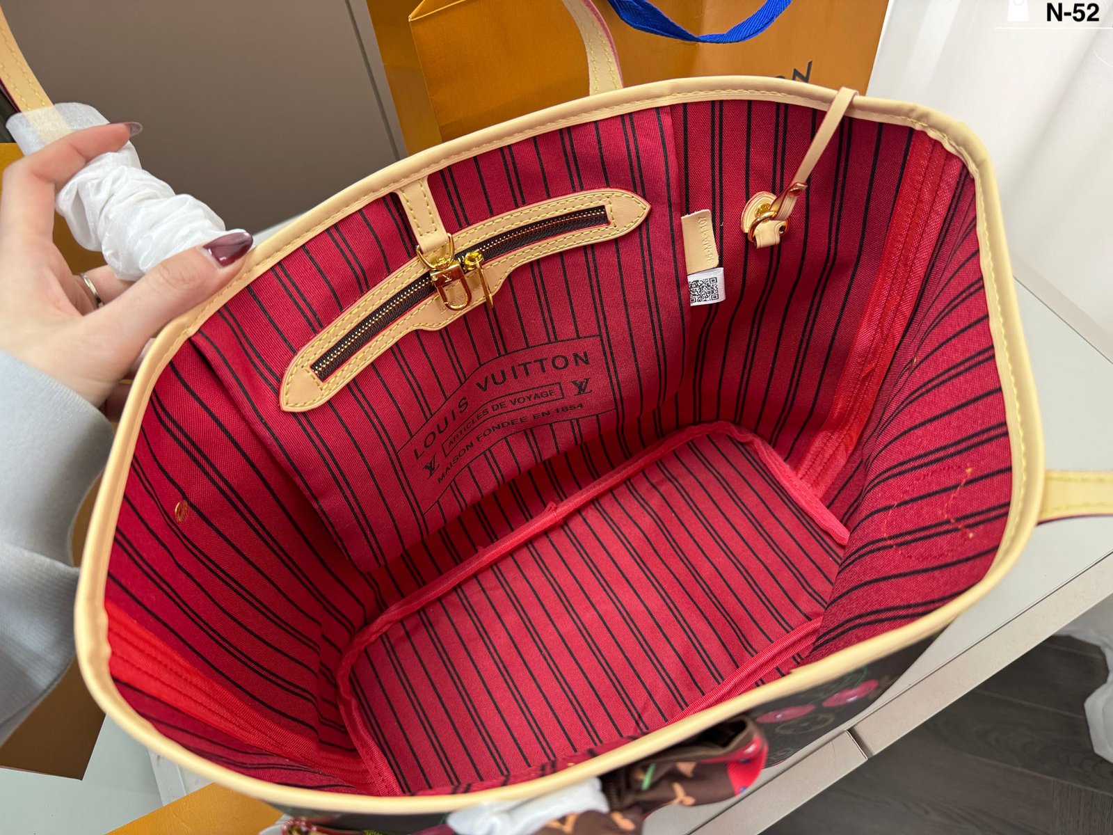 LV x Takashi Murakami collaboration cherry blossom Neverfull medium handbag, classic Monogram canvas + cherry print, playful and full of artistic flair! Natural cowhide trim + metal hardware, exquisite details.