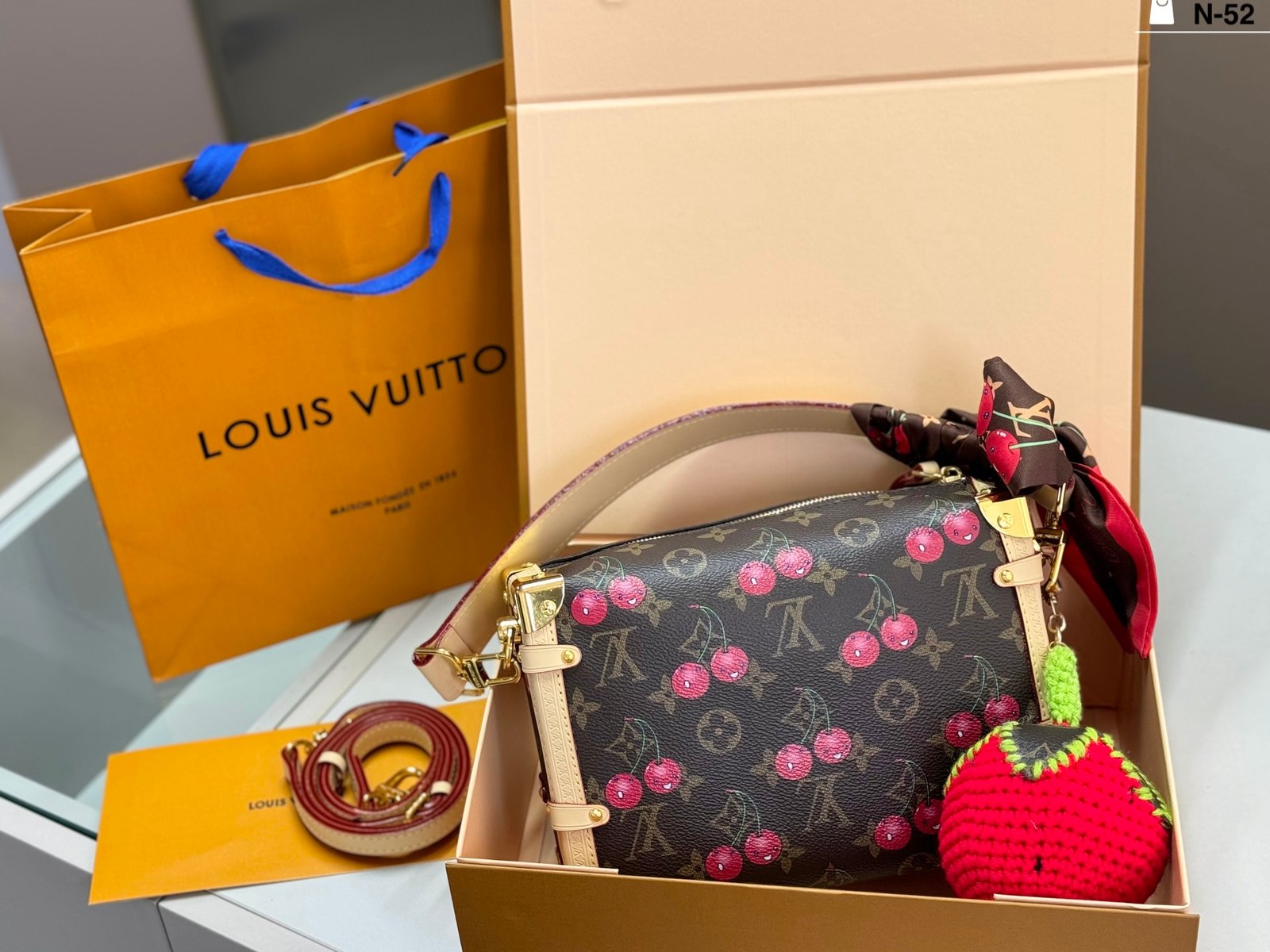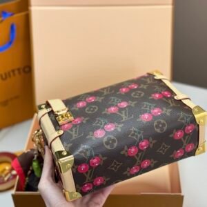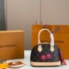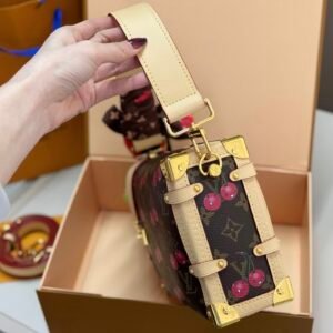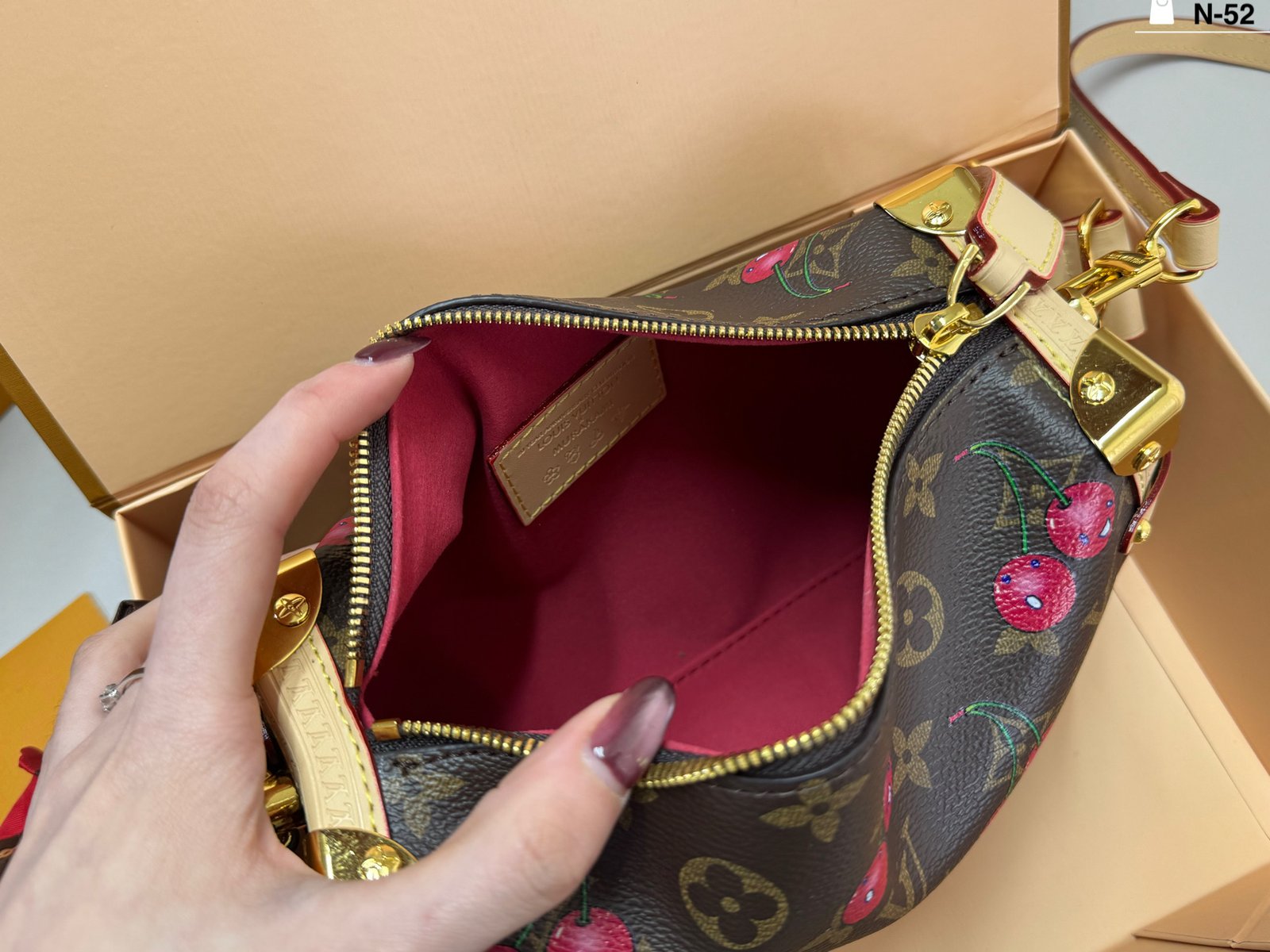 LV x Takashi Murakami cherry collaboration handbag, classic Monogram canvas with playful cherry embroidery, retro yet sweet and cool! Metal clasp and leather shoulder strap, can be carried by hand or crossbody, super versatile for everyday wear.