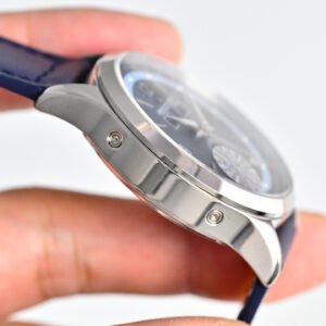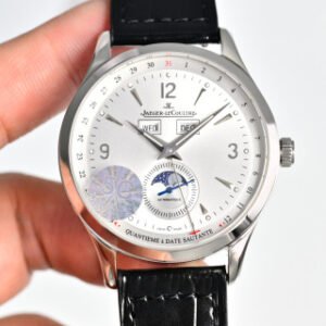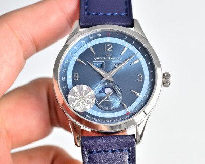 In its 40-mm case in pink gold, the new Master Control Calendar offers its complications their most beautiful role. It gives the time but also the complete calendar, not to mention its ingenious jumping date, finished with a refined red Jaeger-LeCoultre anchor. As its name suggests, this complication allows the date indicator to literally jump between the 15th and the 16th day of the month, ceding place for the moon phase. In an aperture at 6 o’clock, the star of the night is revealed or hidden against a background of the starry midnight blue sky.