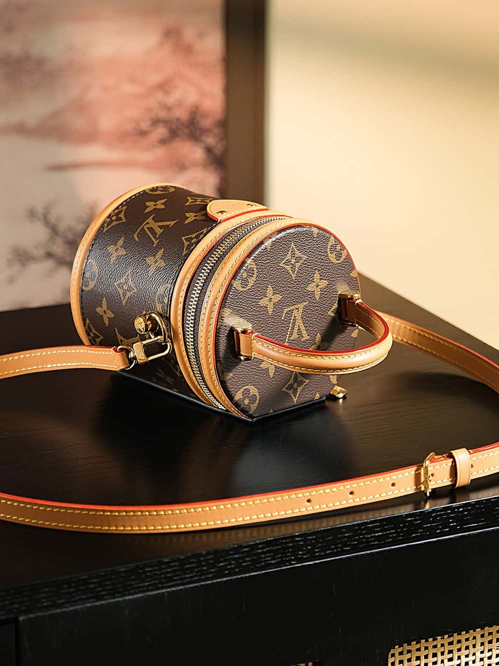The Nano Cannes bag in Monogram canvas is notable for its cylindrical shape, which was inspired by a beauty case. This meticulously crafted piece is complemented by natural leather trim, including a tag embossed with the Louis Vuitton signature. Its top handle and adjustable, removable shoulder strap offer different carry options.