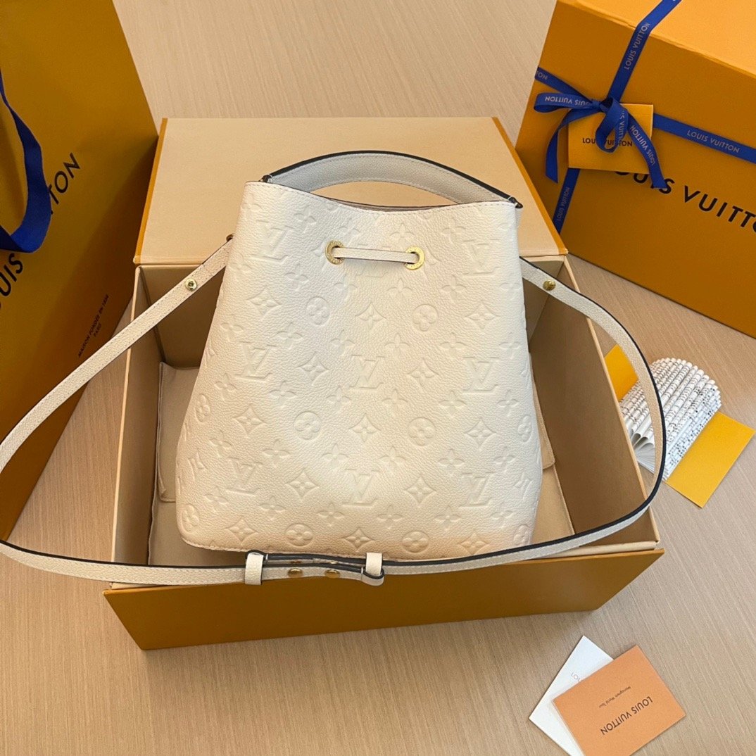 The House’s emblematic bucket bag, the NéoNoé MM, is fashioned from luminous cream-color Monogram Empreinte leather, making it stylish no matter the season. The cream-color microfiber lining and Monogram Flowers and LVs discretely embossed into the leather bring understated charm. A top handle and leather shoulder strap offer a variety of carry options.
