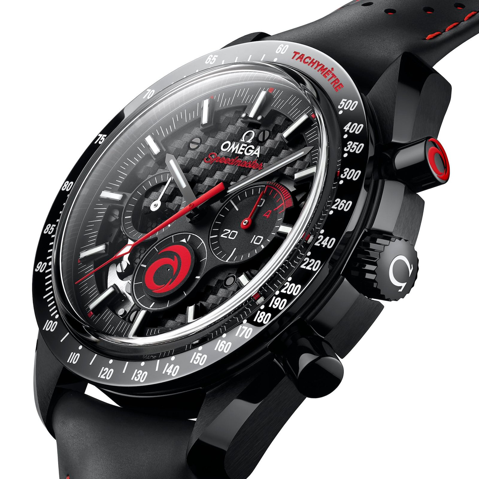- 44mm black zirconium oxide ceramic case paired with a perforated black and red rubber strap