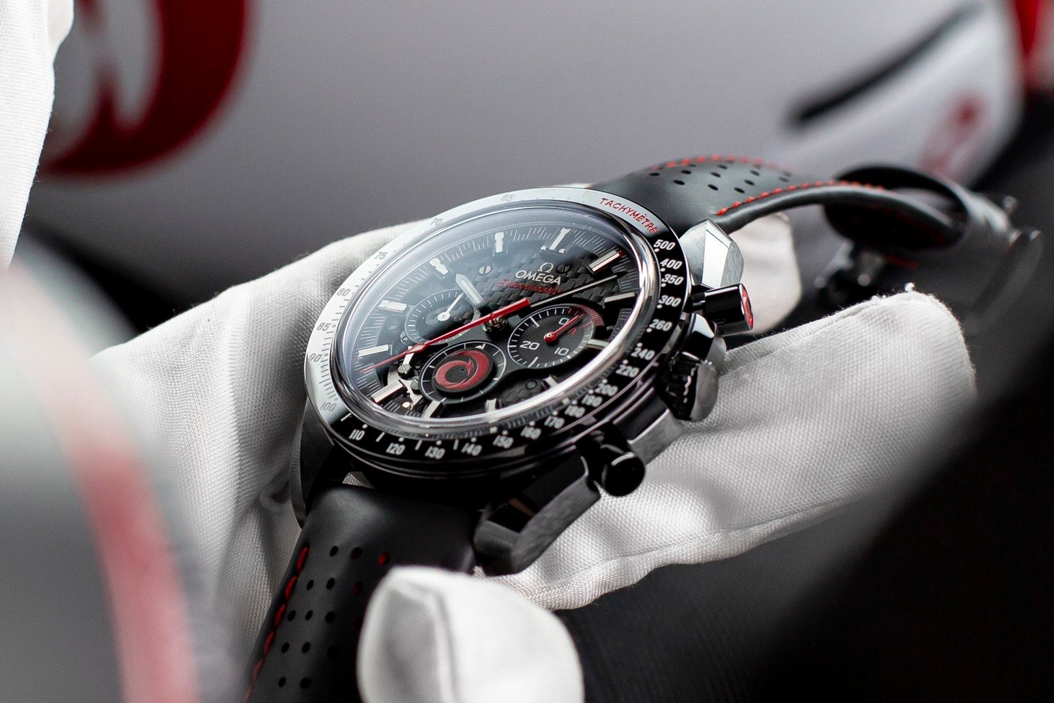 This 44mm model features a black zirconium oxide ceramic case, paired with a perforated black and red rubber strap.
