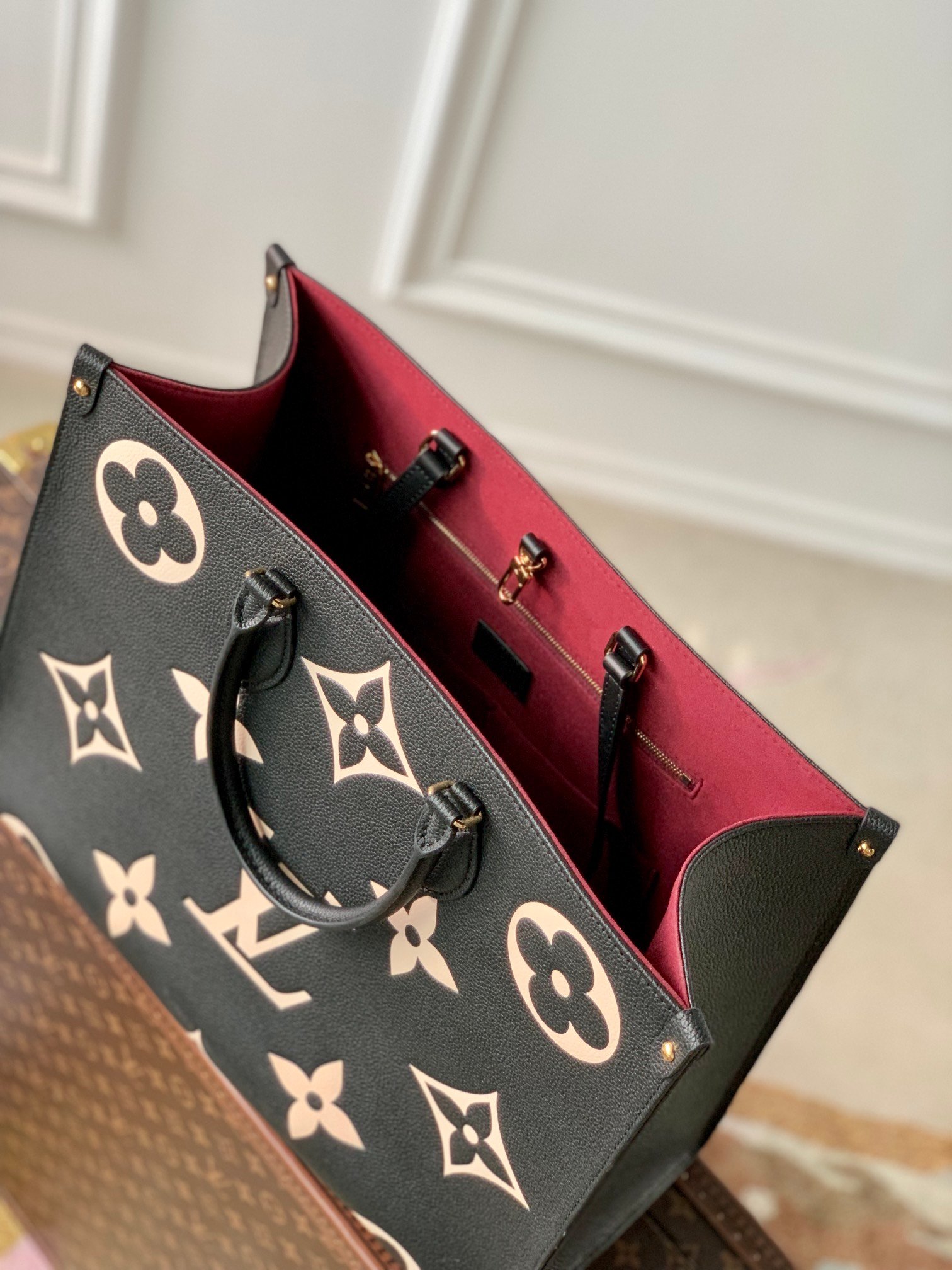 This bicolor edition of the OnTheGo tote is made from Monogram Empreinte leather, embossed with oversized Monogram Flowers and the LV Initials. A stylish and versatile bag for business, shopping or travel, this spacious carryall features two Toron handles as well as a pair of long shoulder straps, for a multitude of comfortable carry options.
