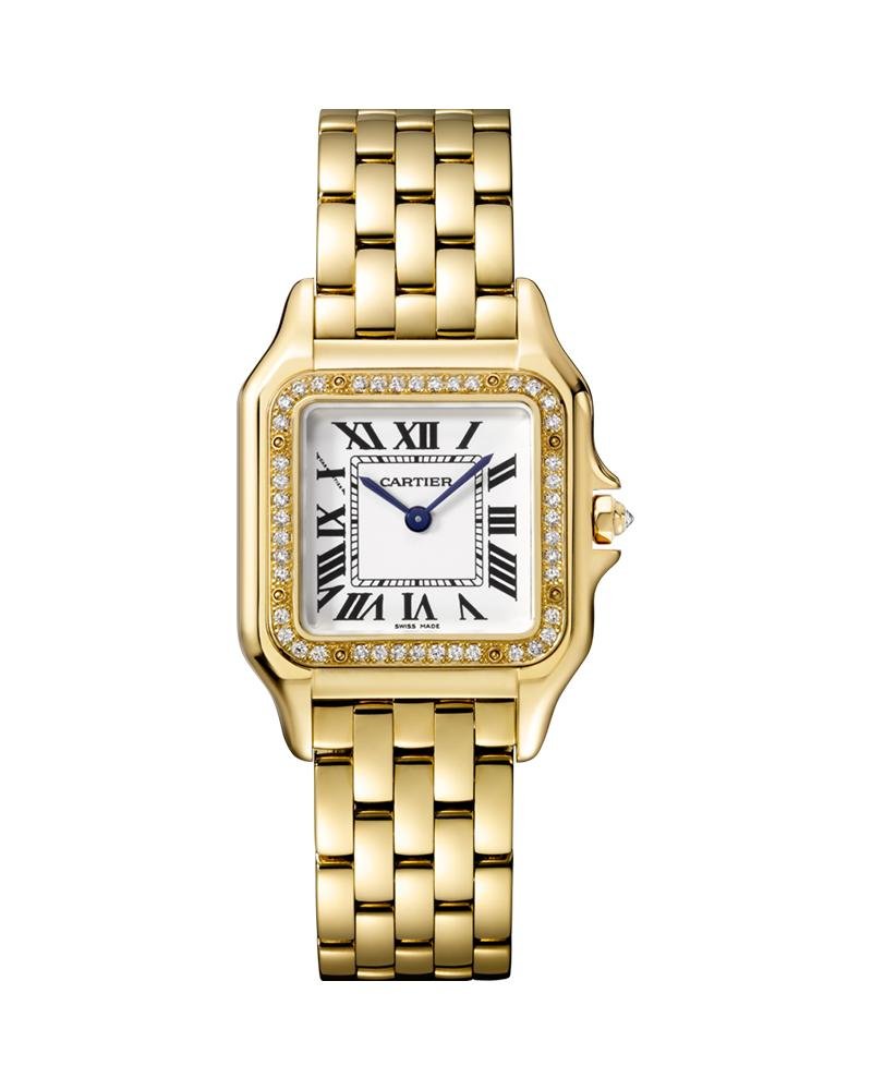 Panthere de Cartier watch, medium model, quartz movement. Case in 18K yellow gold set with brilliant-cut diamonds, crown set with a diamond, silvered dial, blued-steel sword-shaped hands, 18K yellow gold bracelet,