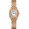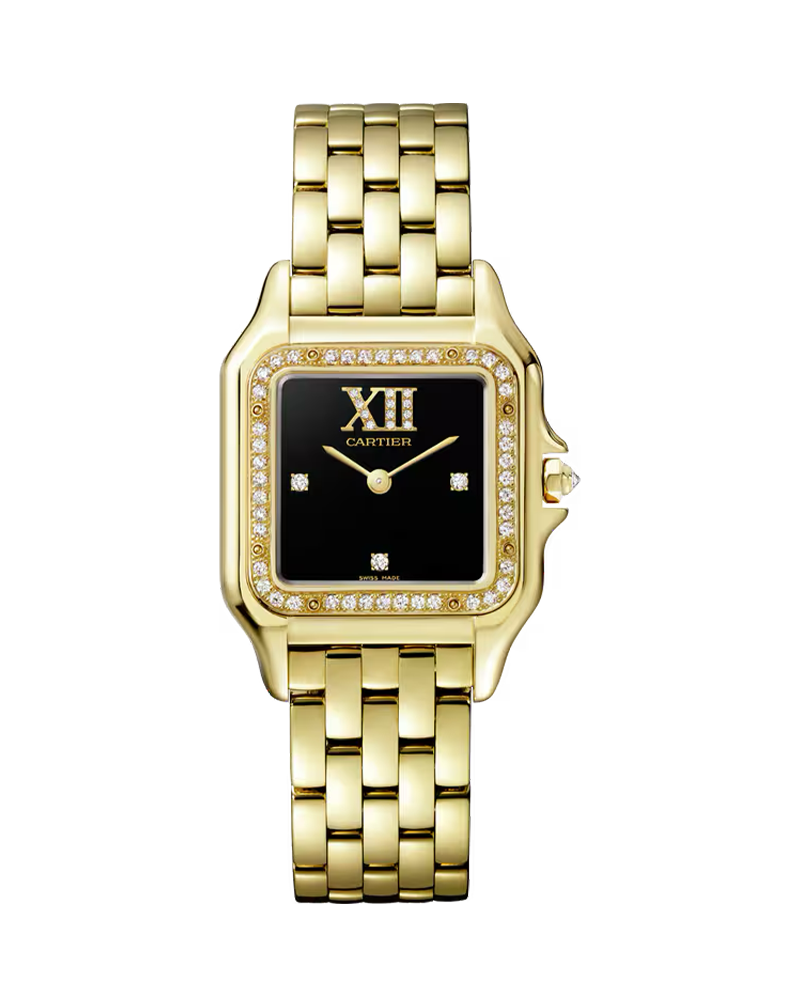 Panthère de Cartier watch, medium model, quartz movement. 18K yellow gold (750/1000) case set with 44 brilliant-cut diamonds totaling 0.28 carats. Dimensions: 36.5 mm x 26.7 mm, thickness: 6.8 mm. 18K yellow gold (750/1000) octagonal crown set with a brilliant-cut diamond totaling 0.02 carats. Black lacquer dial set with 15 brilliant-cut diamonds totaling 0.03 carats, golden-finish sword-shaped hands. 18K yellow gold (750/1000) bracelet. water-resistant up to 3 bar (approx. 30 meters/100 feet)