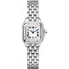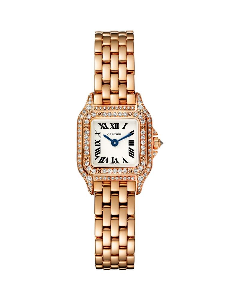 Panthere de Cartier watch, mini model, quartz movement. 18K pink gold case set with brilliant-cut diamonds. 18K pink gold octagonal crown set with a brilliant-cut diamond. Silvered dial, blued-steel sword-shaped hands, sapphire crystal. 18K pink gold bracelet.