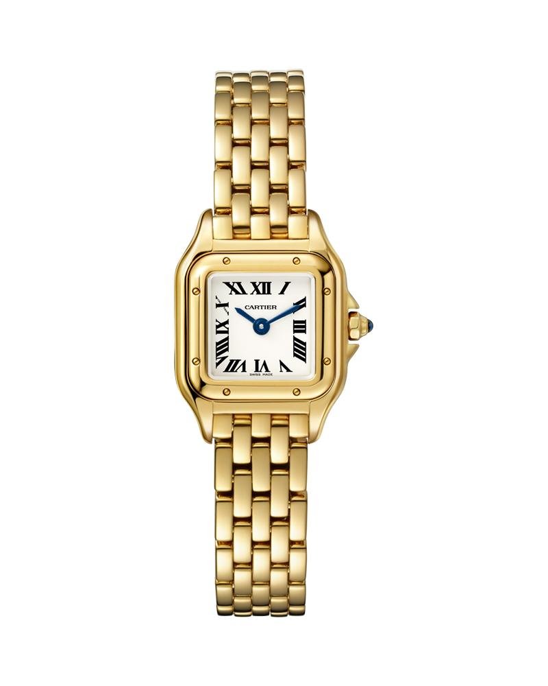 Panthere de Cartier watch, mini model, quartz movement. 18K yellow gold case and bracelet. 18K yellow gold octagonal crown set with a sapphire cabochon. Silvered dial, blued-steel sword-shaped hands, sapphire crystal.