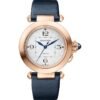 Pasha de Cartier watch, 35 mm, mechanical movement with automatic winding, calibre 1847 MC. Steel case, 18K rose gold bezel, fluted crown cap and crown set with synthetic spinels, silvered flinquŽ dial, blued-steel diamond-shaped hands, bracelet in 18K rose gold and steel with “”SmartLink”” adjustment system, second strap in navy blue Leather strap, interchangeable steel folding buckle. Both are fitted with the “”QuickSwitch”” interchangeable system. Case diameter: 35 mm, thickness: 9.37 mm. Water-resistant to 10 bar (approx. 100 metres).