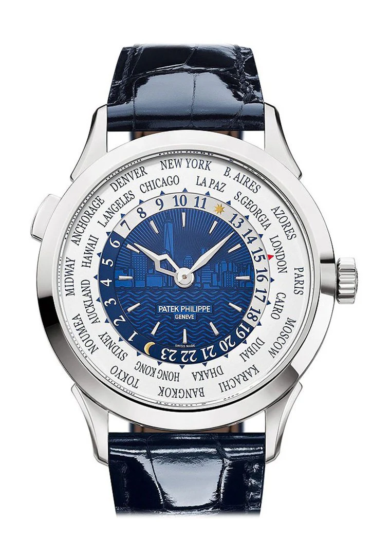 Silver-tone 18kt white gold case with a blue crocodile leather strap. Fixed silver-tone 18kt white gold bezel. White dial with gold-tone hands and index hour markers. World time scale. Dial Type: Analog. Word time, day/night indicator subdials. Patek Philippe Calibre 240 HU automatic movement with a 48-hour power reserve. Scratch resistant sapphire crystal. Transparent case back. Round case shape. Case size: 38.5 mm. Fold over clasp. Water resistant at 30 meters / 100 feet. Functions: world time, GMT, second time zone, hour, minute, day/night indicator. Luxury watch style. Watch label: Swiss Made. Patek Philippe White Gold World Time NY Edition Watch Ref. 5230G-010. 5230G-
