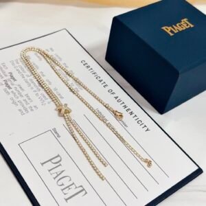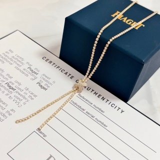 A rose, enhanced by diamonds and lit up by the warm gleam of rose gold, blooms at the curve of the neck. Like a lucky charm, it slides along its chain according to the wish of the wearer, from the heart to the top of the neckline. This emblematic Piaget flower explores the sensual metaphor while moving with delicate elegance.