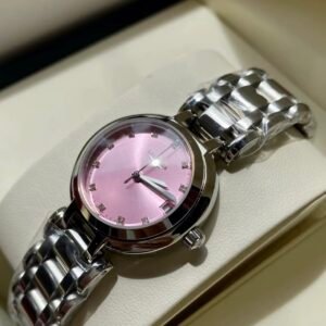 Quartz movement, 30-meter water resistance, women’s watch, Swiss made, 30mm pink dial, stainless steel case, stainless steel bracelet