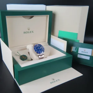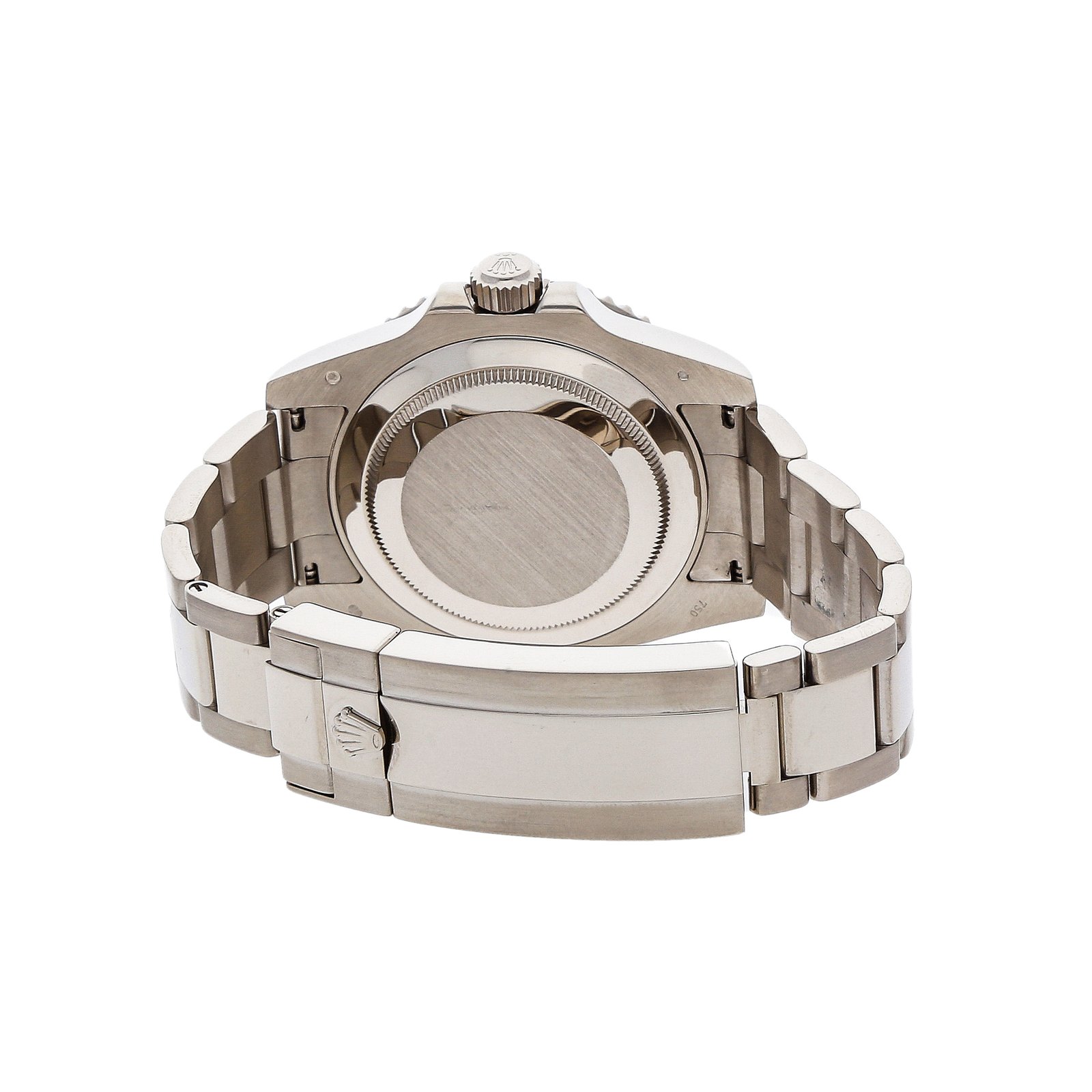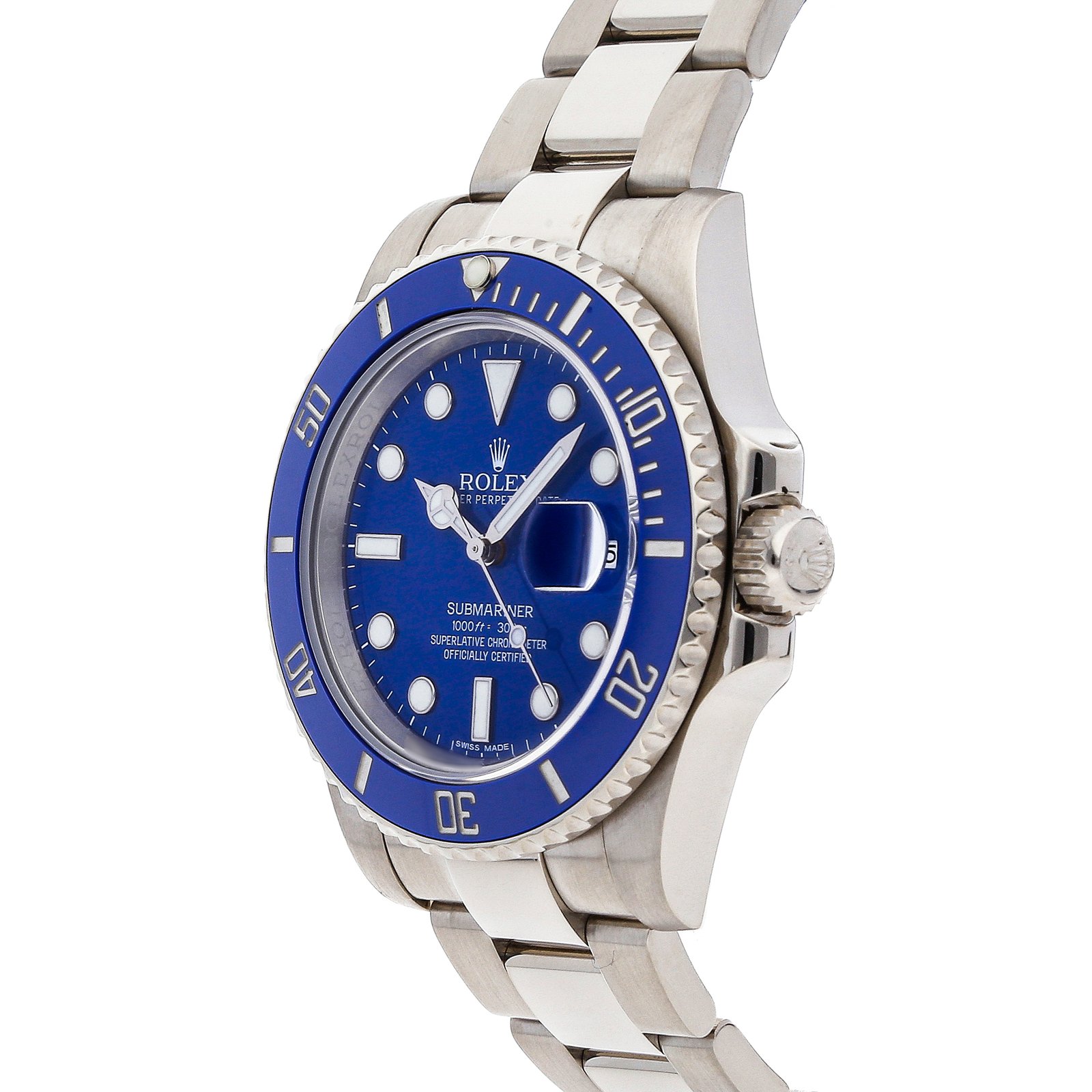 Pre-Owned Rolex Submariner Date “Smurf” (116619LB) self – winding automatic watch, features a 40mm 18k white gold case surrounding a blue dial on an 18k white gold Oyster bracelet with folding buckle. Functions include hours, minutes, seconds and date. This watch does not come with box or papers. Scattered Serial.We back this watch with a 2-Year WatchBox warranty!