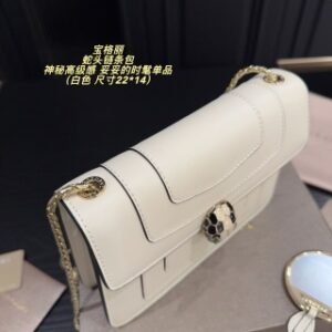 Crafted in white agate calf leather, the Serpenti Forever medium shoulder bag blends urban glam with on-trend wearability. Endowed with a snake body-shaped chain strap, the everyday creation is topped by the iconic snakehead closure, whose mesmerizing scales and design draw from the Serpenti jewels of the 60s. Featuring two compartments, the model is completed with a frontal and a back patch pocket, a partition zipped pocket, an internal open pocket, a customizable mirror and the Bvlgari metal logo on the back. 25 x 17 x 8 cm – 9.8 x 6.7 x 3.1 inches. Made in Italy.