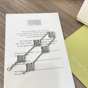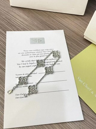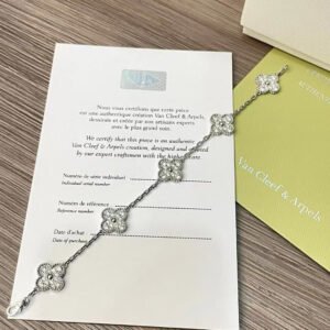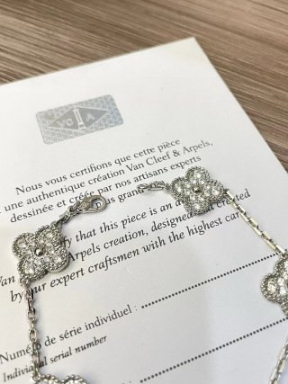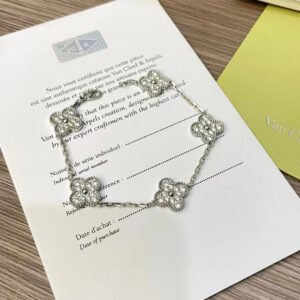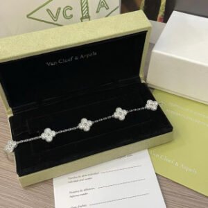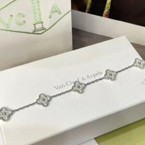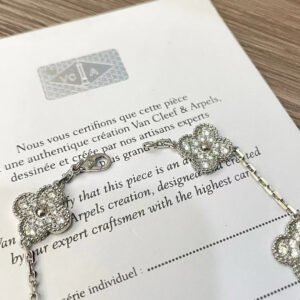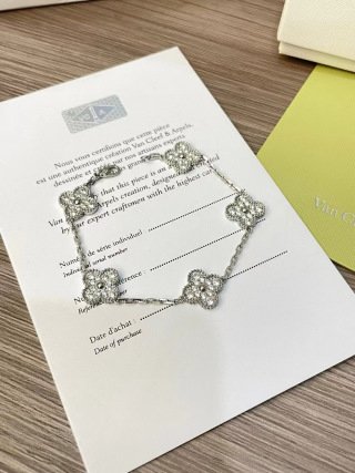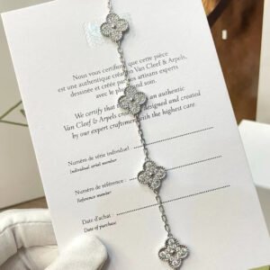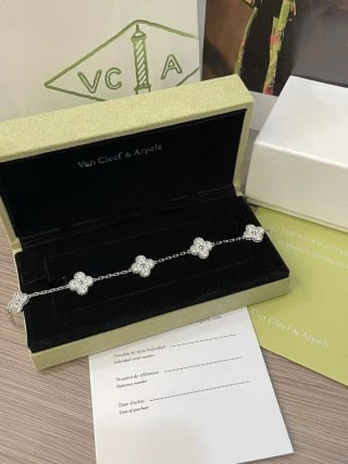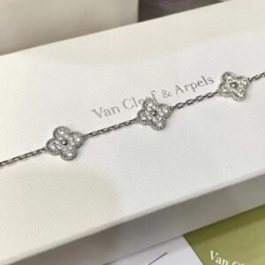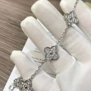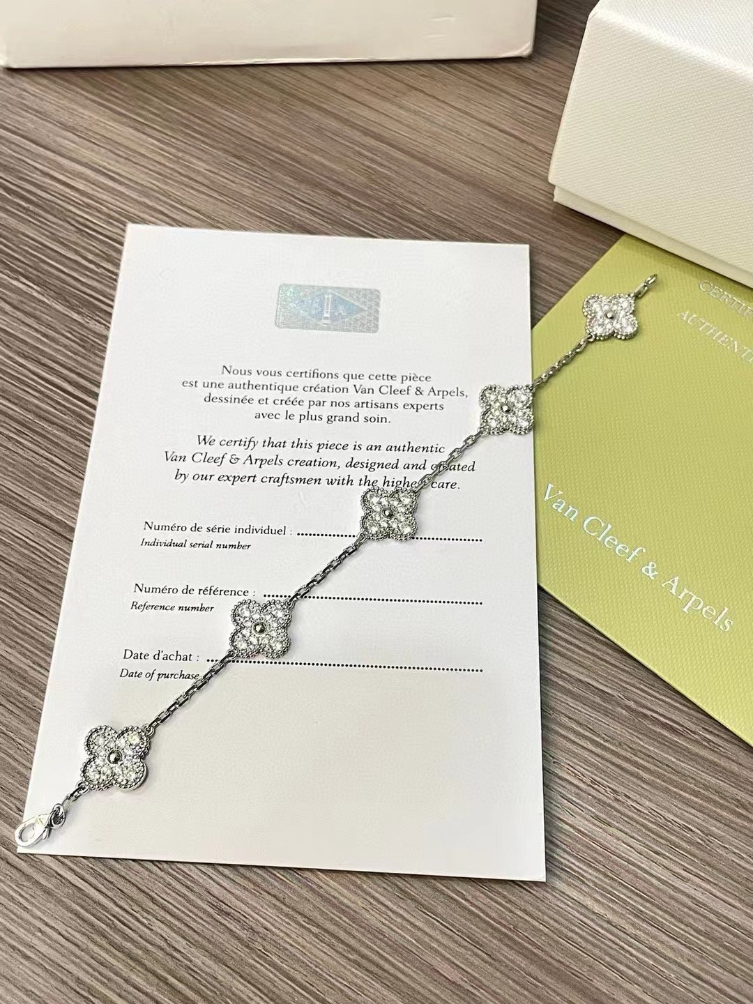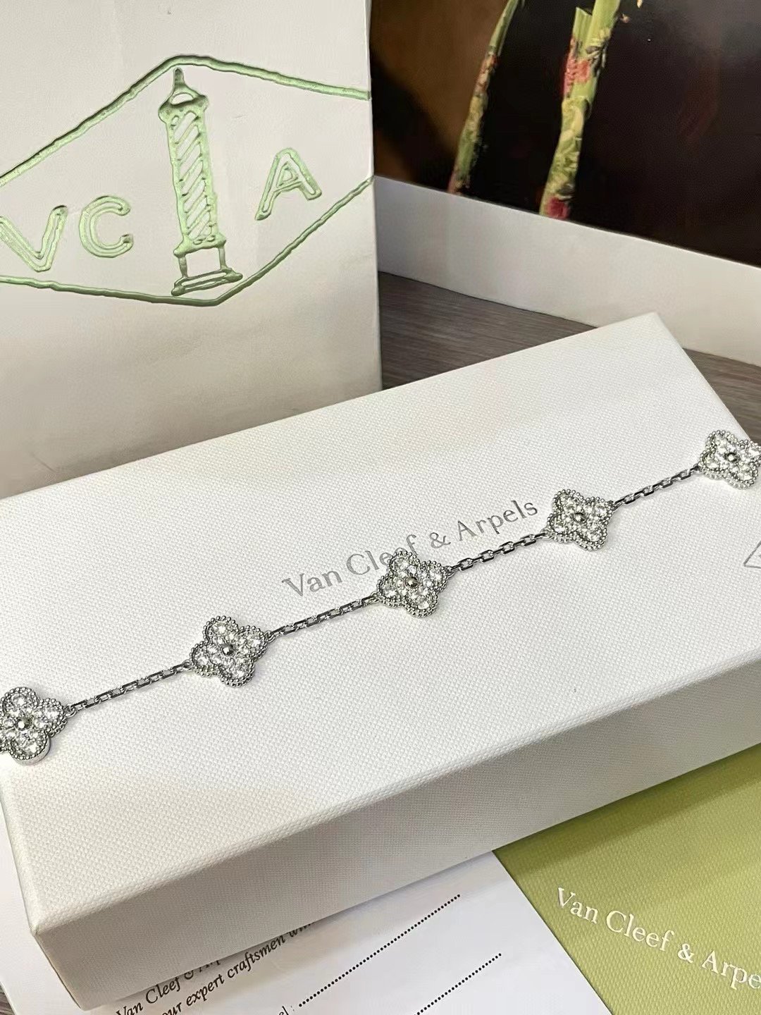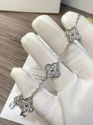 Sweet Alhambra bracelet, 6 motifs, rhodium plated 18K white gold, round diamonds; diamond quality DEF, IF to VVS.