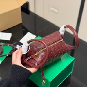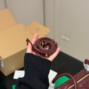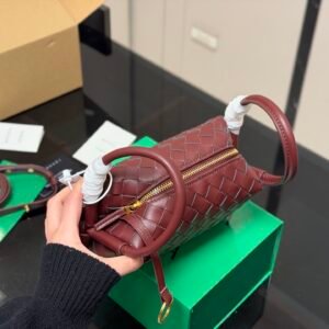 Intrecciato leather cross-body bag with double handles and detachable strap.
