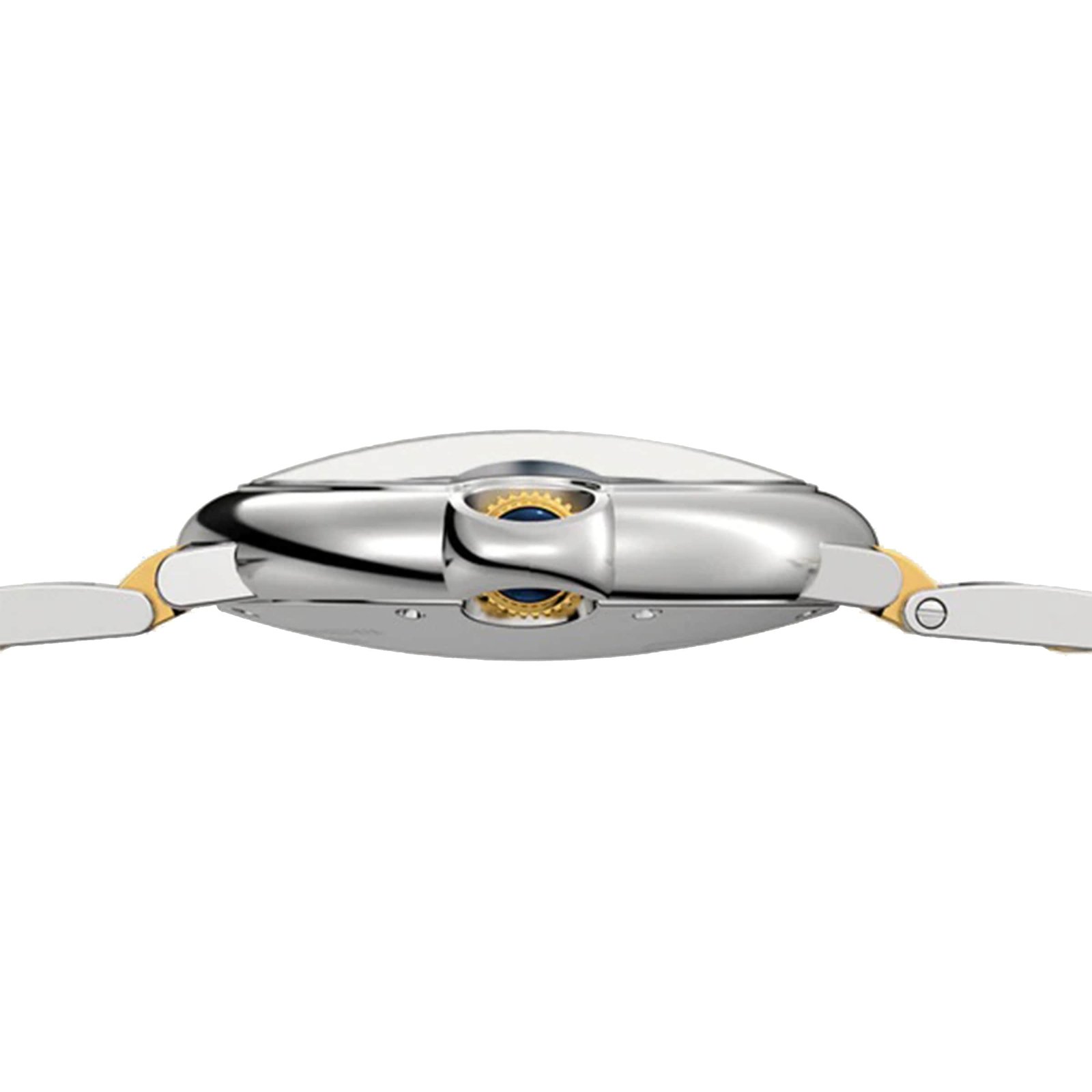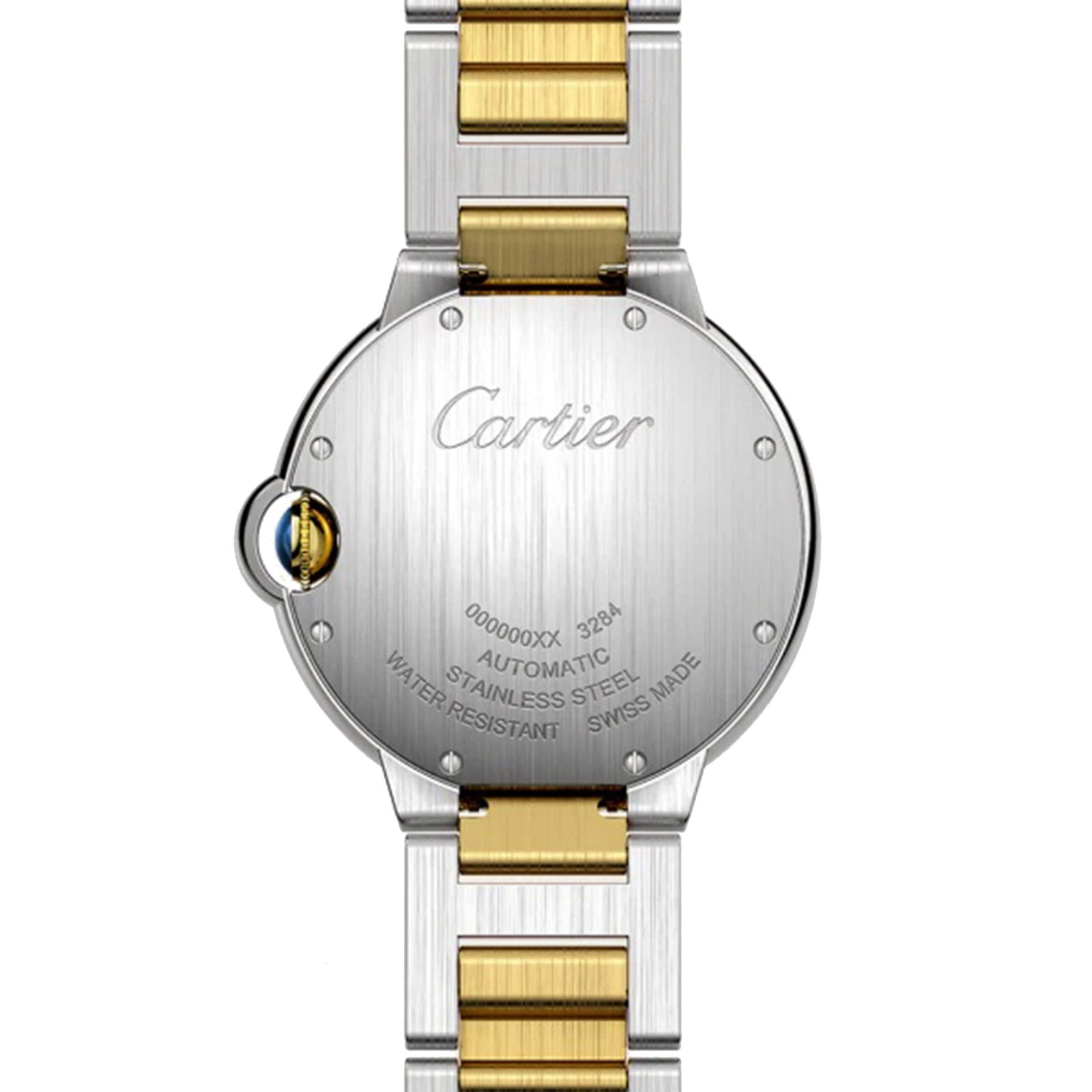 Ballon Bleu de Cartier watch, 36 mm, mechanical movement with automatic winding. Steel case, yellow gold 750/1000 fluted crown set with a cabochon synthetic spinel. Silver guilloché dial. Blued-steel sword-shaped hands. Sapphire crystal. Two-tone interchangeable bracelet. Case thickness: 12.1 mm. Water-resistant up to 3 bar (approx. 30 meters/100 feet).