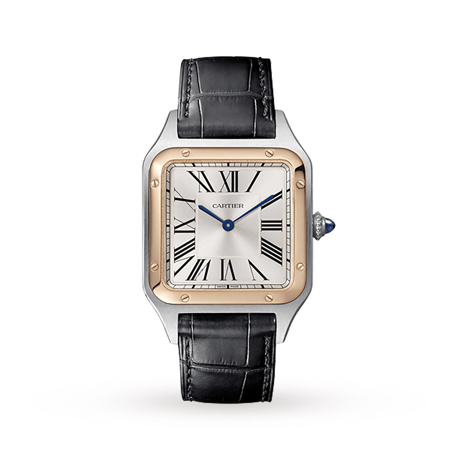 Santos-Dumont watch, large model, high autonomy quartz movement (~ 6 years). Steel case, 18K pink gold bezel, steel beaded crown set with a blue synthetic cabochon-shaped spinel, satin-brushed silver dial with sunray effect, Roman numerals, blued-steel sword-shaped hands, sapphire crystal. Strap in black alligator leather, with steel ardillon buckle. Case dimensions: 43.5 mm x 31.4 mm, thickness: 7.3 mm. Water-resistant up to 3 bar (approx. 30 meters/100 feet).