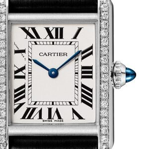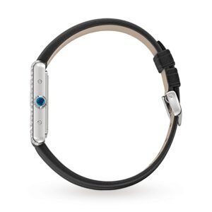 Steel case, bezel set with 40 brilliant-cut diamonds totalling 0.39 carats, beaded crown set with a synthetic cabochon-shaped spinel, silvered dial, blued-steel sword-shaped hands, strap in black brushed calfskin, steel ardillon buckle. Case dimensions: 29.5 mm x 22 mm, thickness: 6.6 mm. Water-resistant to 3 bar (approx. 30 metres).