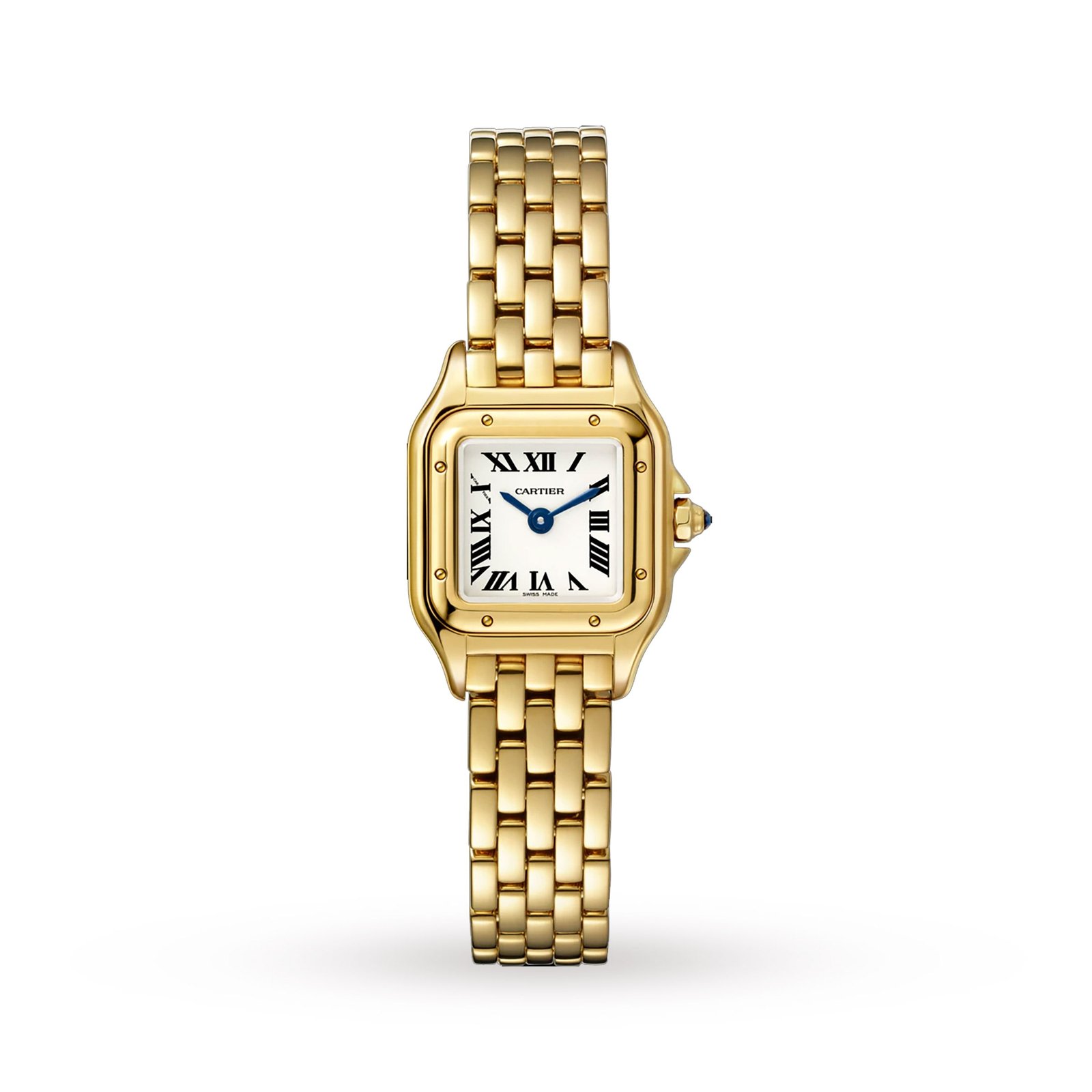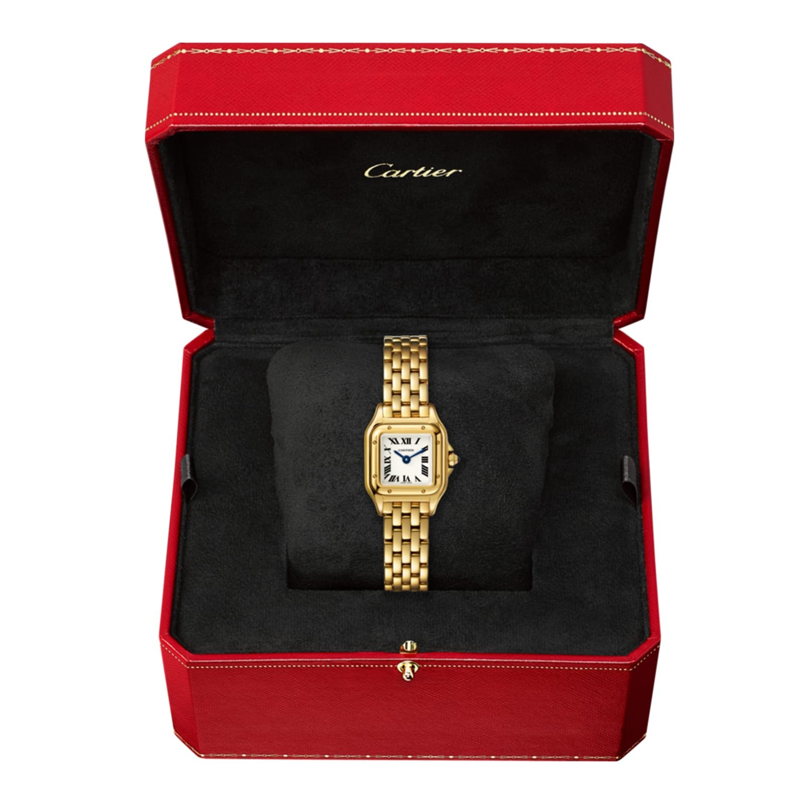 Panthère de Cartier watch, mini model, quartz movement. 18K yellow gold case and bracelet. 18K yellow gold octagonal crown set with a sapphire cabochon. Silver dial, blued-steel sword-shaped hands, sapphire crystal. Case dimensions: 25 mm x 21 mm, thickness: 6 mm. Water-resistant up to 3 bar (approx. 30 meters/100 feet).