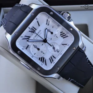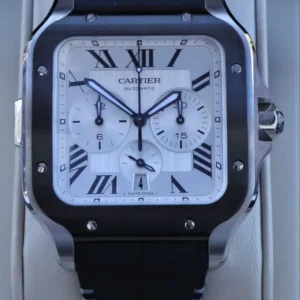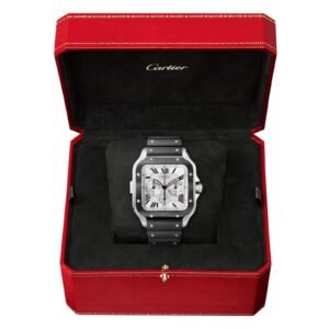 Santos watch, extra large model, chronograph mechanical movement with automatic winding, calibre 1904 CH MC. Steel case, ADLC bezel, 7-sided crown set with a faceted black synthetic spinel, satin-brushed silvered dial, black steel sword-shaped hands with luminescent material, sapphire crystal. First bracelet in rubber, second in black “Gomma” alligator skin, with steel folding buckle. Both bracelets are fitted with the “QuickSwitch” interchangeability system. Case width: 43.3 mm, case thickness: 12.5 mm. Water-resistant to 10 bar (approx. 100 metres).