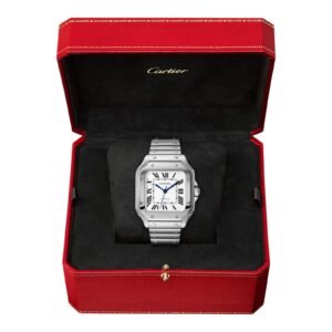 Santos watch, medium model, Manufacture mechanical movement with automatic winding, caliber 1847 MC. Steel case, 7-sided crown set with a faceted synthetic spinel, silvered opaline dial, steel sword-shaped hands, sapphire crystal. Steel bracelet with “SmartLink” adjustment system. Second bracelet in calfskin, with interchangeable steel folding buckle. Both bracelets are fitted with the “QuickSwitch” interchangeability system. Case width: 35.1 mm, thickness: 8.83 mm. Water-resistant up to 10 bar (approx. 100 meters/100 feet).