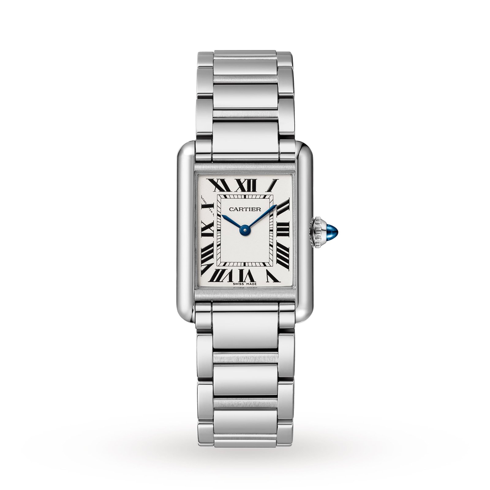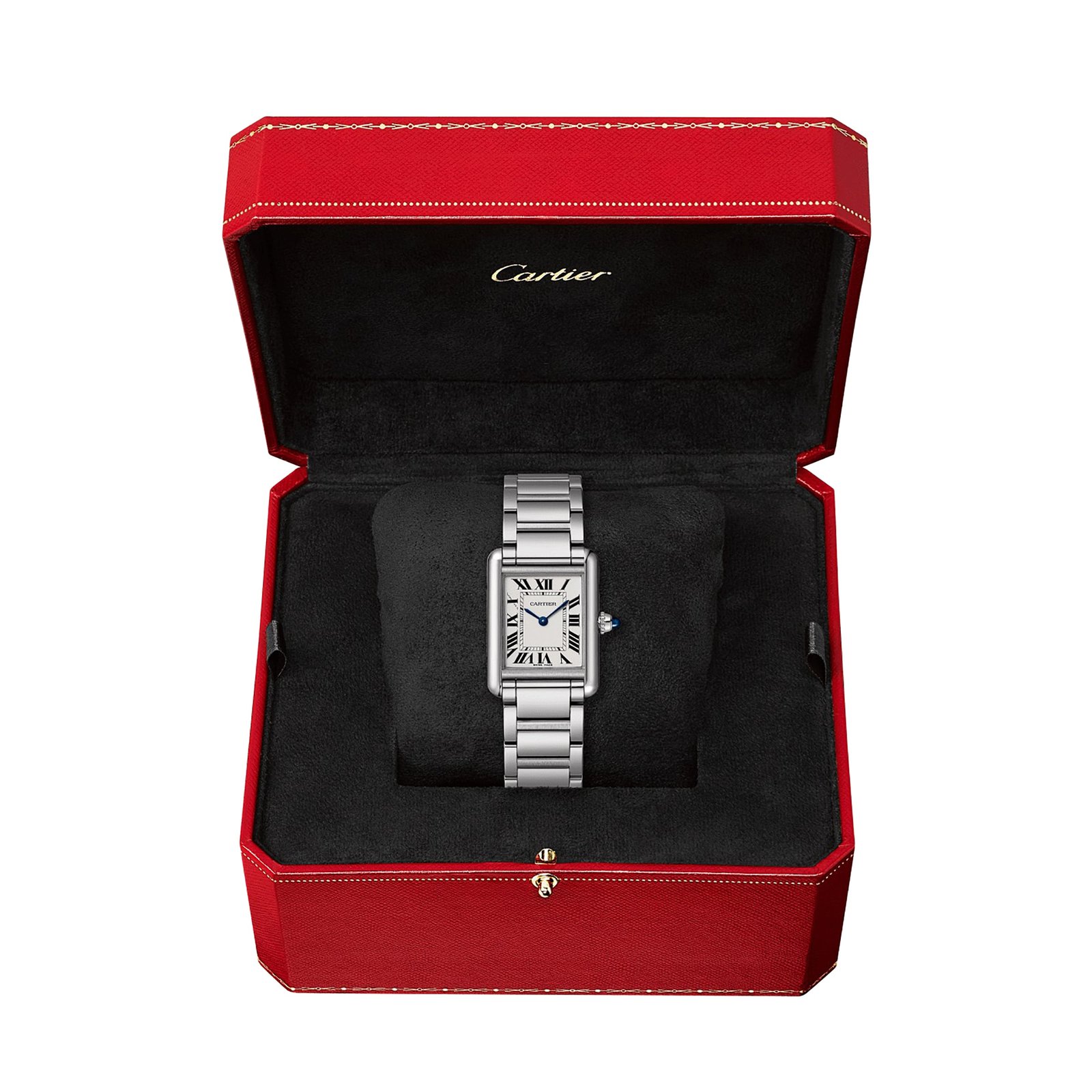 Tank Must watch, small model, quartz movement. Steel case, beaded crown set with a synthetic cabochon-shaped spinel, silvered dial, blued-steel sword-shaped hands, steel bracelet. Case dimensions: 29.5 mm x 22 mm, thickness: 6.6 mm. Water-resistant to 3 bar (approx. 30 metres).